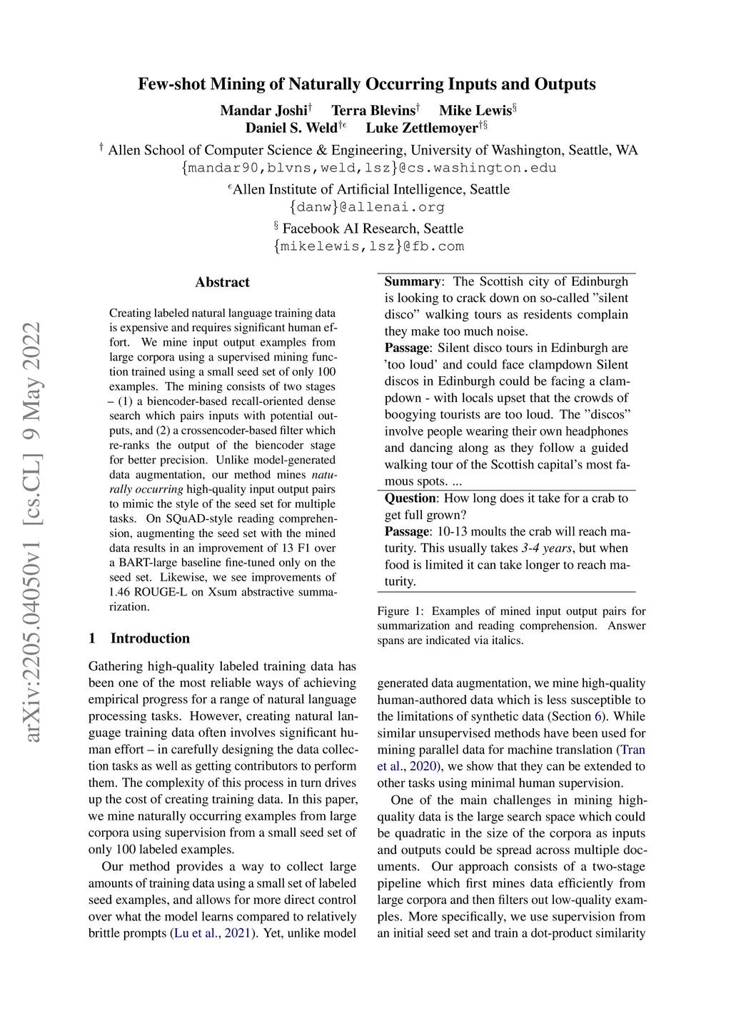 Creating labeled natural language training data is expensive and requires significant human effort. We mine input output examples from large corpora using a supervised mining function trained using a small seed set of only 100 examples. The mining consists of two stages -- (1) a biencoder-based recall-oriented dense search which pairs inputs with potential outputs, and (2) a crossencoder-based filter which re-ranks the output of the biencoder stage for better precision. Unlike model-generated data augmentation, our method mines naturally occurring high-quality input output pairs to mimic the style of the seed set for multiple tasks. On SQuAD-style reading comprehension, augmenting the seed set with the mined data results in an improvement of 13 F1 over a BART-large baseline fine-tuned only on the seed set. Likewise, we see improvements of 1.46 ROUGE-L on Xsum abstractive summarization.