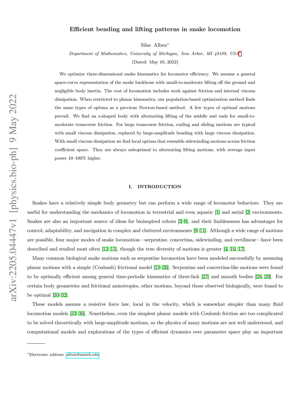 We optimize three-dimensional snake kinematics for locomotor efficiency. We assume a general space-curve representation of the snake backbone with small-to-moderate lifting off the ground and negligible body inertia. The cost of locomotion includes work against friction and internal viscous dissipation. When restricted to planar kinematics, our population-based optimization method finds the same types of optima as a previous Newton-based method. A few types of optimal motions prevail. We find an s-shaped body with alternating lifting of the middle and ends for small-to-moderate transverse friction. For large transverse friction, curling and sliding motions are typical with small viscous dissipation, replaced by large-amplitude bending with large viscous dissipation. With small viscous dissipation we find local optima that resemble sidewinding motions across friction coefficient space. They are always suboptimal to alternating lifting motions, with average input power 10--100\% higher.