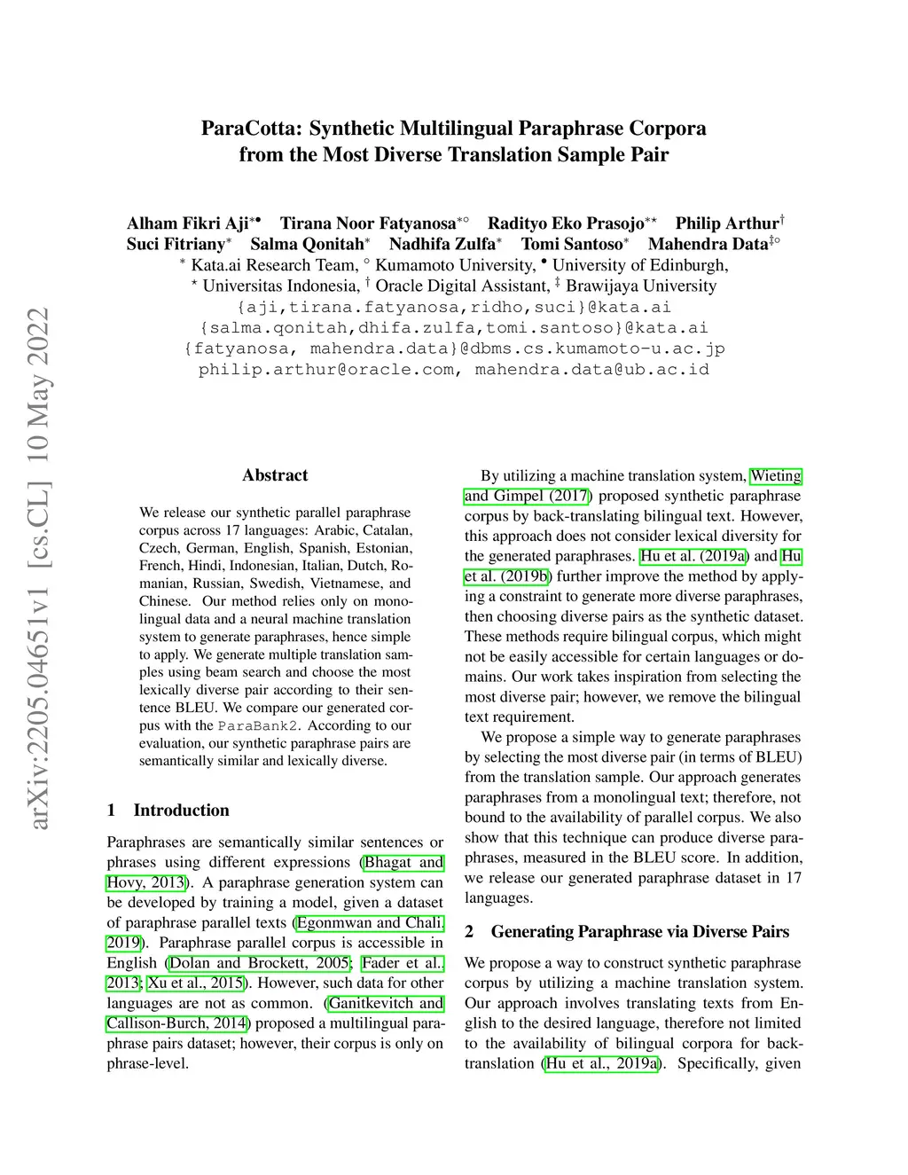 We release our synthetic parallel paraphrase corpus across 17 languages: Arabic, Catalan, Czech, German, English, Spanish, Estonian, French, Hindi, Indonesian, Italian, Dutch, Romanian, Russian, Swedish, Vietnamese, and Chinese. Our method relies only on monolingual data and a neural machine translation system to generate paraphrases, hence simple to apply. We generate multiple translation samples using beam search and choose the most lexically diverse pair according to their sentence BLEU. We compare our generated corpus with the \texttt{ParaBank2}. According to our evaluation, our synthetic paraphrase pairs are semantically similar and lexically diverse.