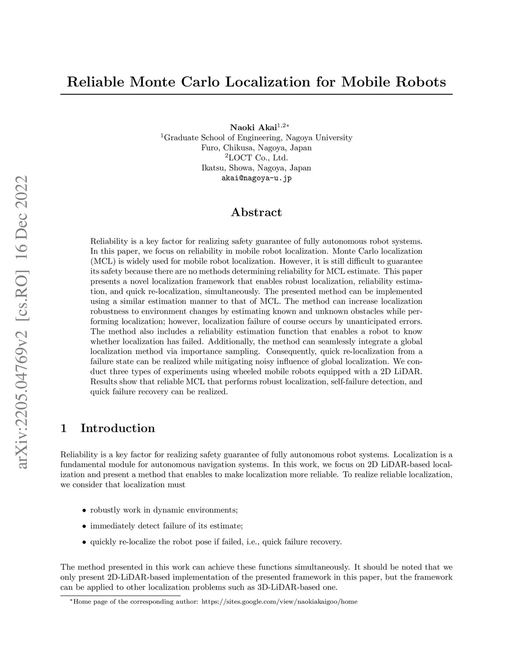 Reliability is a key factor for realizing safety guarantee of full autonomous robot systems. In this paper, we focus on reliability in mobile robot localization. Monte Carlo localization (MCL) is widely used for mobile robot localization. However, it is still difficult to guarantee its safety because there are no methods determining reliability for MCL estimate. This paper presents a novel localization framework that enables robust localization, reliability estimation, and quick re-localization, simultaneously. The presented method can be implemented using similar estimation manner to that of MCL. The method can increase localization robustness to environment changes by estimating known and unknown obstacles while performing localization; however, localization failure of course occurs by unanticipated errors. The method also includes a reliability estimation function that enables us to know whether localization has failed. Additionally, the method can seamlessly integrate a global localization method via importance sampling. Consequently, quick re-localization from failures can be realized while mitigating noisy influence of global localization. Through three types of experiments, we show that reliable MCL that performs robust localization, self-failure detection, and quick failure recovery can be realized.