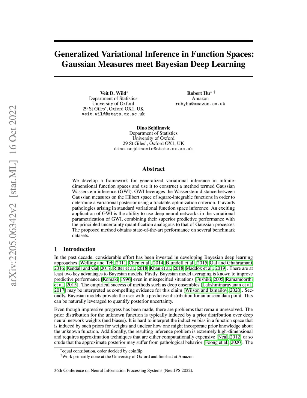 We develop a framework for generalized variational inference in infinite-dimensional function spaces and use it to construct a method termed Gaussian Wasserstein inference (GWI). GWI leverages the Wasserstein distance between Gaussian measures on the Hilbert space of square-integrable functions in order to determine a variational posterior using a tractable optimisation criterion and avoids pathologies arising in standard variational function space inference. An exciting application of GWI is the ability to use deep neural networks in the variational parametrisation of GWI, combining their superior predictive performance with the principled uncertainty quantification analogous to that of Gaussian processes. The proposed method obtains state-of-the-art performance on several benchmark datasets.