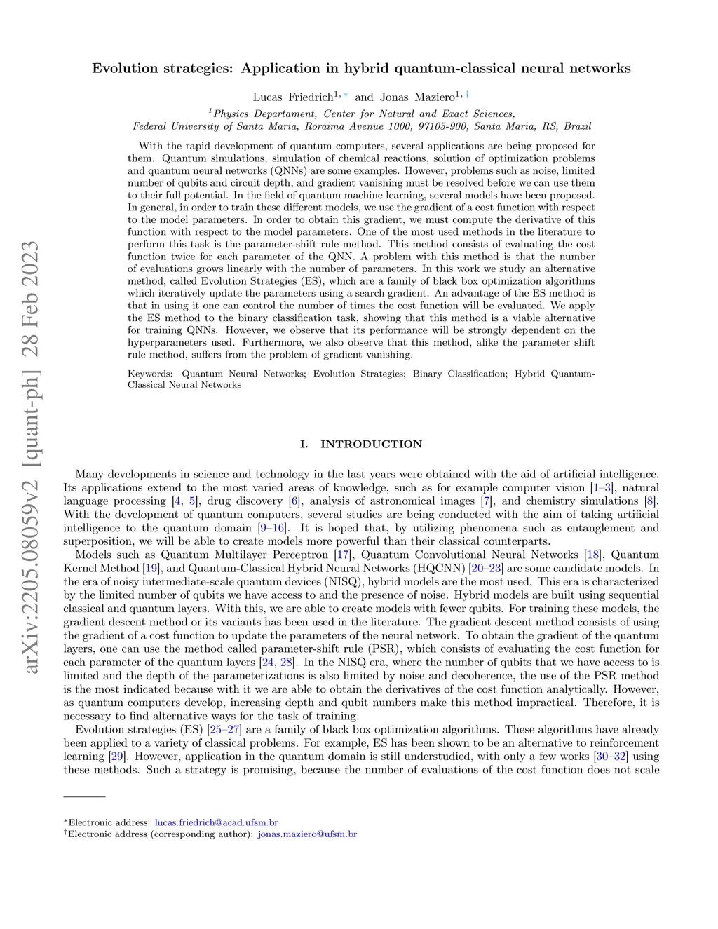 Evolution strategies: Application in hybrid quantum-classical neural