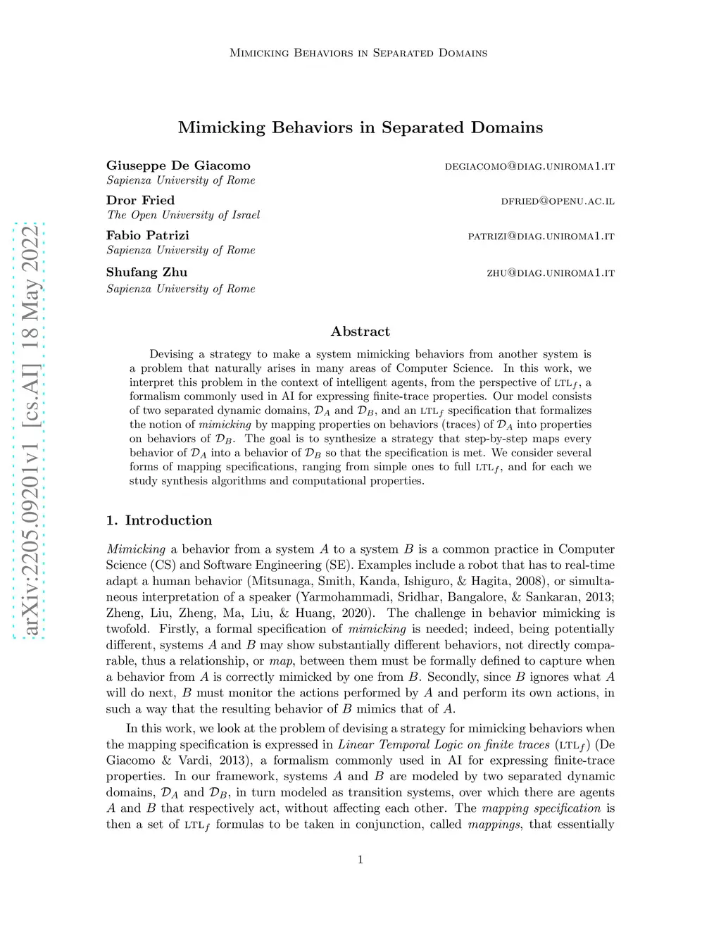 Devising a strategy to make a system mimicking behaviors from another system is a problem that naturally arises in many areas of Computer Science. In this work, we interpret this problem in the context of intelligent agents, from the perspective of LTLf, a formalism commonly used in AI for expressing finite-trace properties. Our model consists of two separated dynamic domains, D_A and D_B, and an LTLf specification that formalizes the notion of mimicking by mapping properties on behaviors (traces) of D_A into properties on behaviors of D_B. The goal is to synthesize a strategy that step-by-step maps every behavior of D_A into a behavior of D_B so that the specification is met. We consider several forms of mapping specifications, ranging from simple ones to full LTLf, and for each we study synthesis algorithms and computational properties.