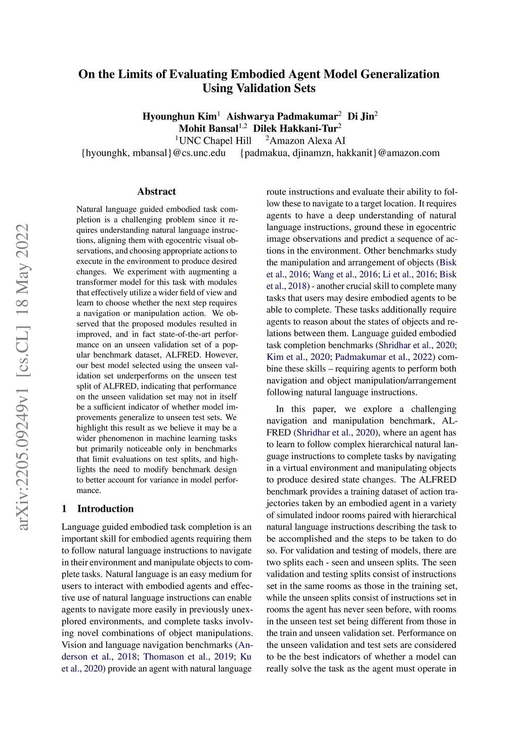Natural language guided embodied task completion is a challenging problem since it requires understanding natural language instructions, aligning them with egocentric visual observations, and choosing appropriate actions to execute in the environment to produce desired changes. We experiment with augmenting a transformer model for this task with modules that effectively utilize a wider field of view and learn to choose whether the next step requires a navigation or manipulation action. We observed that the proposed modules resulted in improved, and in fact state-of-the-art performance on an unseen validation set of a popular benchmark dataset, ALFRED. However, our best model selected using the unseen validation set underperforms on the unseen test split of ALFRED, indicating that performance on the unseen validation set may not in itself be a sufficient indicator of whether model improvements generalize to unseen test sets. We highlight this result as we believe it may be a wider phenomenon in machine learning tasks but primarily noticeable only in benchmarks that limit evaluations on test splits, and highlights the need to modify benchmark design to better account for variance in model performance.