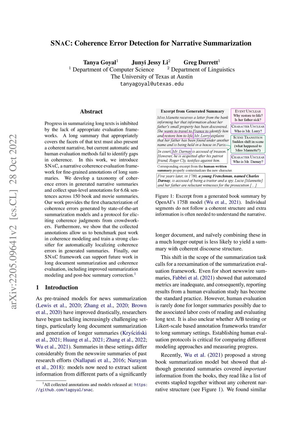 Progress in summarizing long texts is inhibited by the lack of appropriate evaluation frameworks. When a long summary must be produced to appropriately cover the facets of that text, that summary needs to present a coherent narrative to be understandable by a reader, but current automatic and human evaluation methods fail to identify gaps in coherence. In this work, we introduce SNaC, a narrative coherence evaluation framework rooted in fine-grained annotations for long summaries. We develop a taxonomy of coherence errors in generated narrative summaries and collect span-level annotations for 6.6k sentences across 150 book and movie screenplay summaries. Our work provides the first characterization of coherence errors generated by state-of-the-art summarization models and a protocol for eliciting coherence judgments from crowd annotators. Furthermore, we show that the collected annotations allow us to train a strong classifier for automatically localizing coherence errors in generated summaries as well as benchmarking past work in coherence modeling. Finally, our SNaC framework can support future work in long document summarization and coherence evaluation, including improved summarization modeling and post-hoc summary correction.