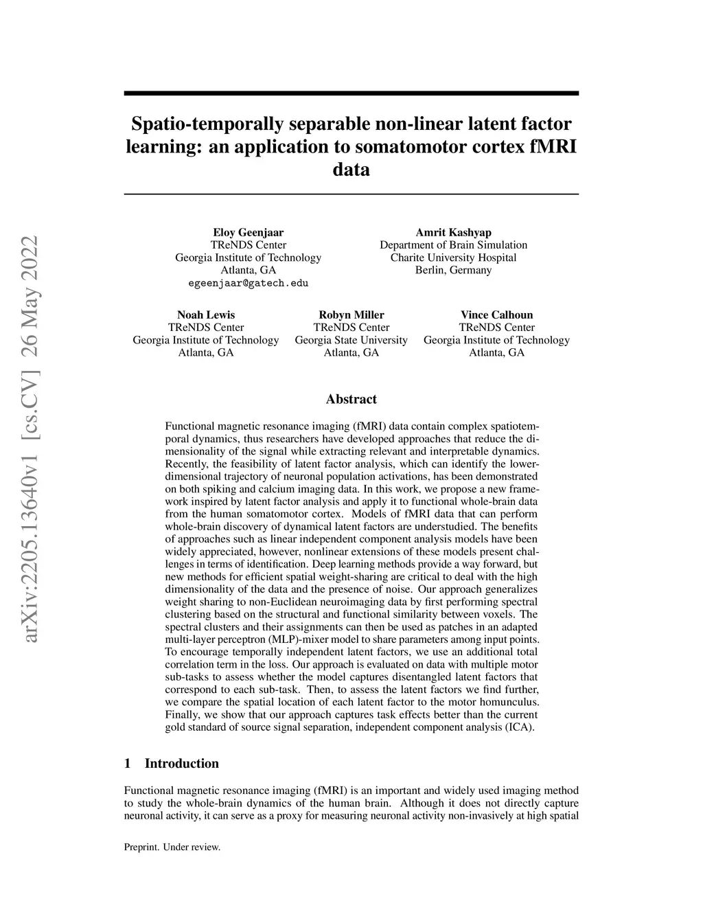 Functional magnetic resonance imaging (fMRI) data contain complex spatiotemporal dynamics, thus researchers have developed approaches that reduce the dimensionality of the signal while extracting relevant and interpretable dynamics. Models of fMRI data that can perform whole-brain discovery of dynamical latent factors are understudied. The benefits of approaches such as linear independent component analysis models have been widely appreciated, however, nonlinear extensions of these models present challenges in terms of identification. Deep learning methods provide a way forward, but new methods for efficient spatial weight-sharing are critical to deal with the high dimensionality of the data and the presence of noise. Our approach generalizes weight sharing to non-Euclidean neuroimaging data by first performing spectral clustering based on the structural and functional similarity between voxels. The spectral clusters and their assignments can then be used as patches in an adapted multi-layer perceptron (MLP)-mixer model to share parameters among input points. To encourage temporally independent latent factors, we use an additional total correlation term in the loss. Our approach is evaluated on data with multiple motor sub-tasks to assess whether the model captures disentangled latent factors that correspond to each sub-task. Then, to assess the latent factors we find further, we compare the spatial location of each latent factor to the motor homunculus. Finally, we show that our approach captures task effects better than the current gold standard of source signal separation, independent component analysis (ICA).