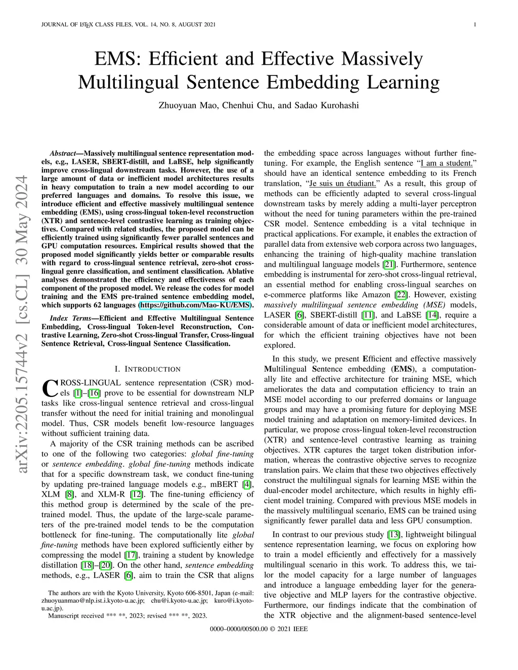 EMS: Efficient and Effective Massively Multilingual Sentence Embedding