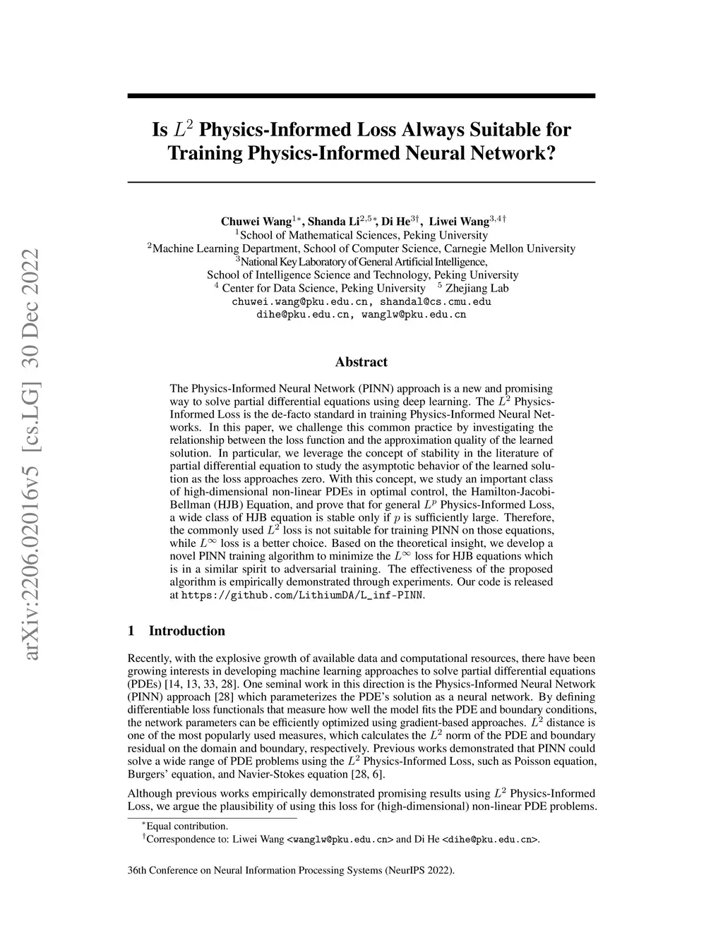 The Physics-Informed Neural Network (PINN) approach is a new and promising way to solve partial differential equations using deep learning. The Physics-Informed Loss is the de-facto standard in training Physics-Informed Neural Networks. In this paper, we challenge this common practice by investigating the relationship between the loss function and the approximation quality of the learned solution. In particular, we leverage the concept of stability in the literature of partial differential equation to study the asymptotic behavior of the learned solution as the loss approaches zero. With this concept, we study an important class of high-dimensional non-linear PDEs in optimal control, the Hamilton-Jacobi-Bellman(HJB) Equation, and prove that for general Physics-Informed Loss, a wide class of HJB equation is stable only if is sufficiently large. Therefore, the commonly used loss is not suitable for training PINN on those equations, while loss is a better choice. Based on the theoretical insight, we develop a novel PINN training algorithm to minimize the loss for HJB equations which is in a similar spirit to adversarial training. The effectiveness of the proposed algorithm is empirically demonstrated through experiments. Our code is released at https://github.com/LithiumDA/L_inf-PINN.