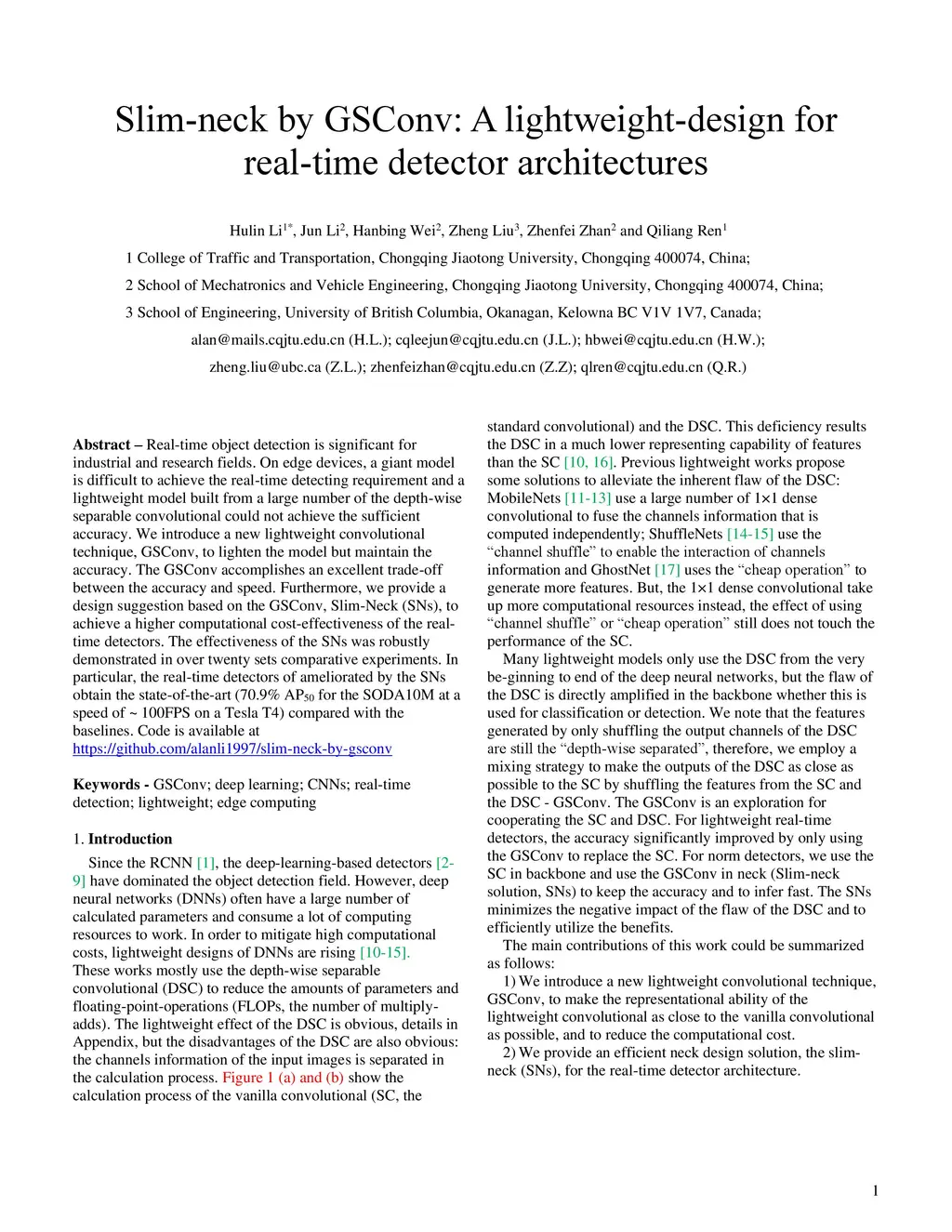 Real-time object detection is significant for industrial and research fields. On edge devices, a giant model is difficult to achieve the real-time detecting requirement and a lightweight model built from a large number of the depth-wise separable convolutional could not achieve the sufficient accuracy. We introduce a new lightweight convolutional technique, GSConv, to lighten the model but maintain the accuracy. The GSConv accomplishes an excellent trade-off between the accuracy and speed. Furthermore, we provide a design suggestion based on the GSConv, Slim-Neck (SNs), to achieve a higher computational cost-effectiveness of the real-time detectors. The effectiveness of the SNs was robustly demonstrated in over twenty sets comparative experiments. In particular, the real-time detectors of ameliorated by the SNs obtain the state-of-the-art (70.9% AP50 for the SODA10M at a speed of ~ 100FPS on a Tesla T4) compared with the baselines. Code is available at https://github.com/alanli1997/slim-neck-by-gsconv