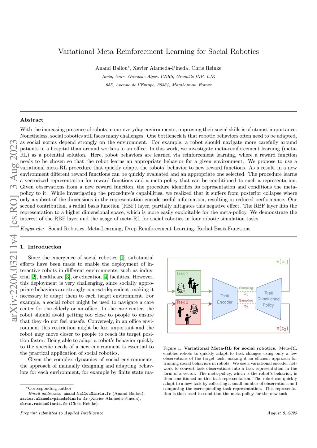 With the increasing presence of robots in our every-day environments, improving their social skills is of utmost importance. Nonetheless, social robotics still faces many challenges. One bottleneck is that robotic behaviors need to be often adapted as social norms depend strongly on the environment. For example, a robot should navigate more carefully around patients in a hospital compared to workers in an office. In this work, we investigate meta-reinforcement learning (meta-RL) as a potential solution. Here, robot behaviors are learned via reinforcement learning where a reward function needs to be chosen so that the robot learns an appropriate behavior for a given environment. We propose to use a variational meta-RL procedure that quickly adapts the robots' behavior to new reward functions. As a result, given a new environment different reward functions can be quickly evaluated and an appropriate one selected. The procedure learns a vectorized representation for reward functions and a meta-policy that can be conditioned on such a representation. Given observations from a new reward function, the procedure identifies its representation and conditions the meta-policy to it. While investigating the procedures' capabilities, we realized that it suffers from posterior collapse where only a subset of the dimensions in the representation encode useful information resulting in a reduced performance. Our second contribution, a radial basis function (RBF) layer, partially mitigates this negative effect. The RBF layer lifts the representation to a higher dimensional space, which is more easily exploitable for the meta-policy. We demonstrate the interest of the RBF layer and the usage of meta-RL for social robotics on four robotic simulation tasks.
