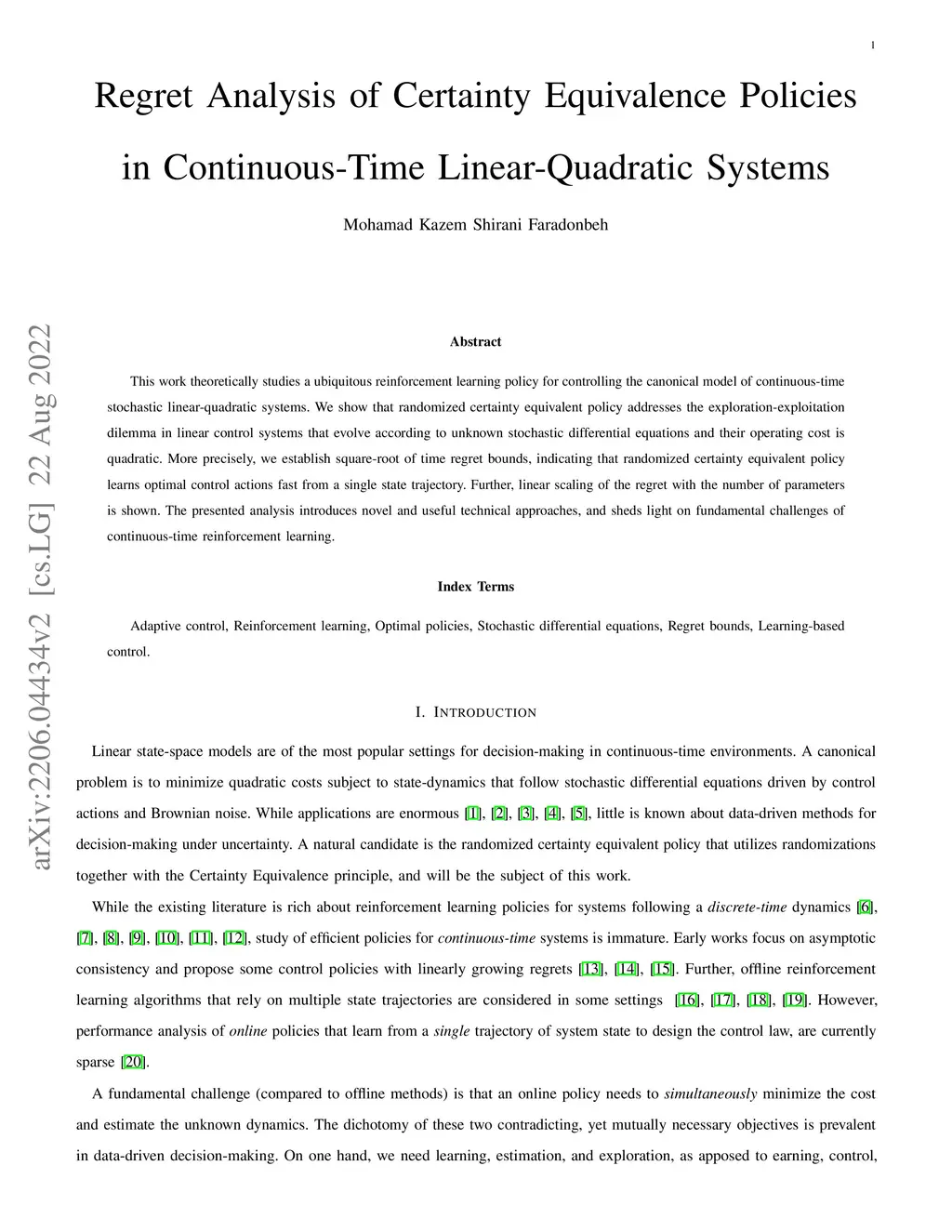 This work theoretically studies a ubiquitous reinforcement learning policy for controlling the canonical model of continuous-time stochastic linear-quadratic systems. We show that randomized certainty equivalent policy addresses the exploration-exploitation dilemma in linear control systems that evolve according to unknown stochastic differential equations and their operating cost is quadratic. More precisely, we establish square-root of time regret bounds, indicating that randomized certainty equivalent policy learns optimal control actions fast from a single state trajectory. Further, linear scaling of the regret with the number of parameters is shown. The presented analysis introduces novel and useful technical approaches, and sheds light on fundamental challenges of continuous-time reinforcement learning.