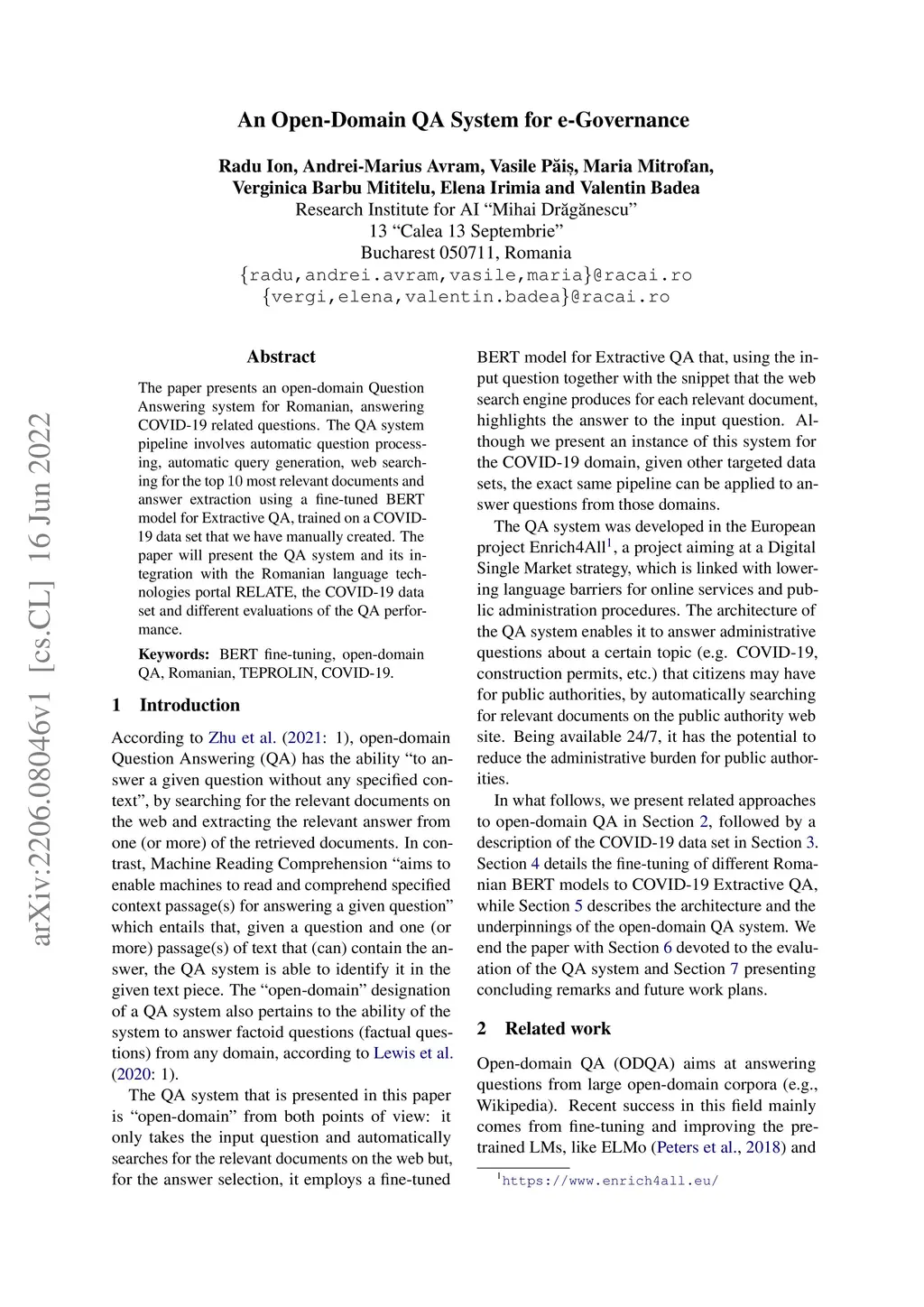 The paper presents an open-domain Question Answering system for Romanian, answering COVID-19 related questions. The QA system pipeline involves automatic question processing, automatic query generation, web searching for the top 10 most relevant documents and answer extraction using a fine-tuned BERT model for Extractive QA, trained on a COVID-19 data set that we have manually created. The paper will present the QA system and its integration with the Romanian language technologies portal RELATE, the COVID-19 data set and different evaluations of the QA performance.