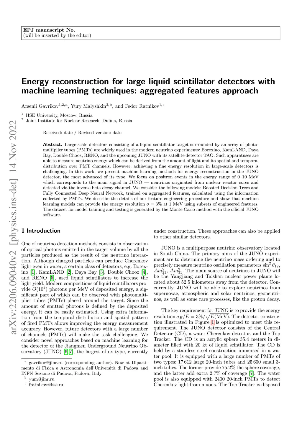 Large-scale detectors consisting of a liquid scintillator target surrounded by an array of photo-multiplier tubes (PMTs) are widely used in the modern neutrino experiments: Borexino, KamLAND, Daya Bay, Double Chooz, RENO, and the upcoming JUNO with its satellite detector TAO. Such apparatuses are able to measure neutrino energy which can be derived from the amount of light and its spatial and temporal distribution over PMT channels. However, achieving a fine energy resolution in large-scale detectors is challenging. In this work, we present machine learning methods for energy reconstruction in the JUNO detector, the most advanced of its type. We focus on positron events in the energy range of 0-10 MeV which corresponds to the main signal in JUNO -- neutrinos originated from nuclear reactor cores and detected via the inverse beta decay channel. We consider the following models: Boosted Decision Trees and Fully Connected Deep Neural Network, trained on aggregated features, calculated using the information collected by PMTs. We describe the details of our feature engineering procedure and show that machine learning models can provide the energy resolution at 1 MeV using subsets of engineered features. The dataset for model training and testing is generated by the Monte Carlo method with the official JUNO software.