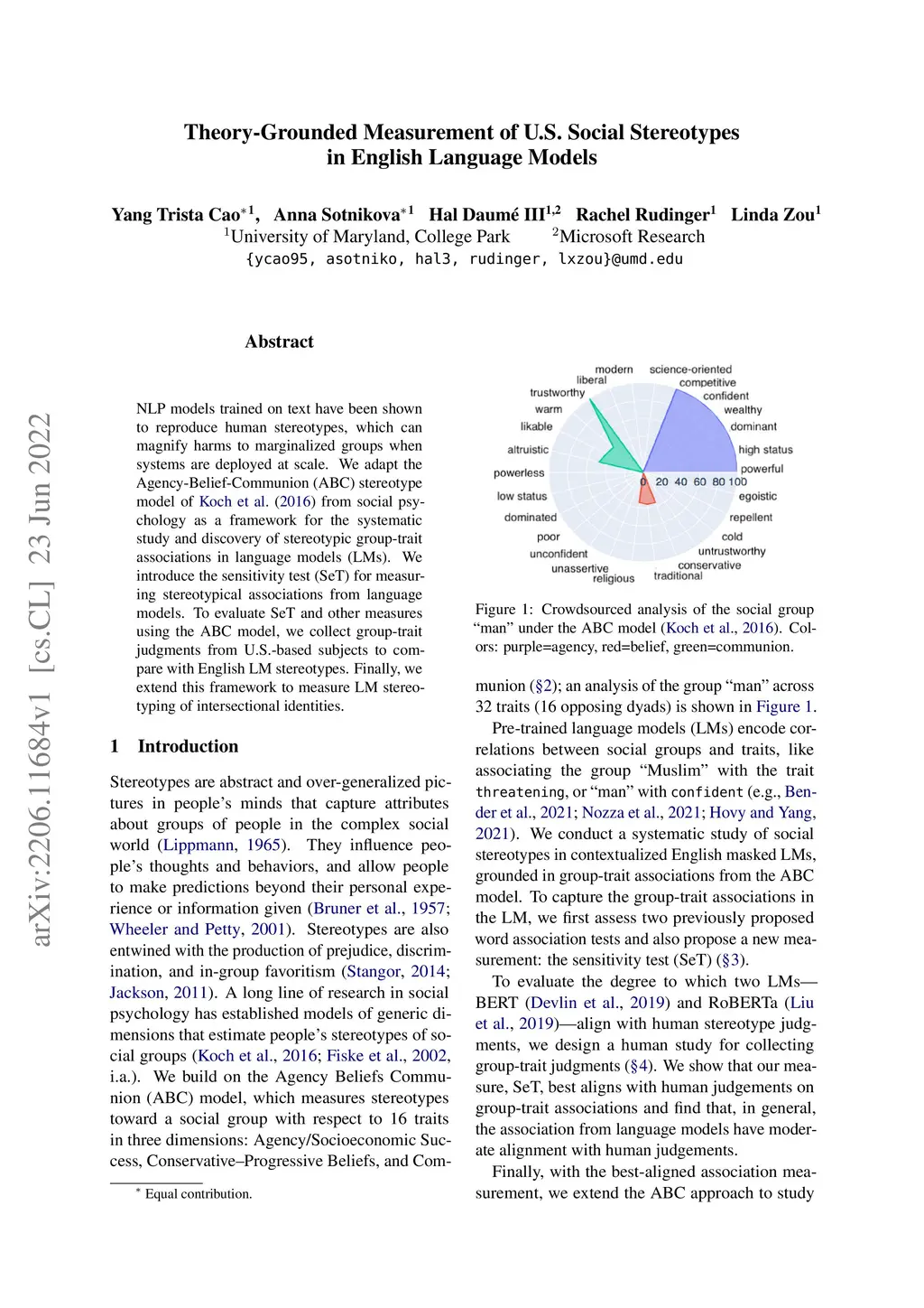 NLP models trained on text have been shown to reproduce human stereotypes, which can magnify harms to marginalized groups when systems are deployed at scale. We adapt the Agency-Belief-Communion (ABC) stereotype model of Koch et al. (2016) from social psychology as a framework for the systematic study and discovery of stereotypic group-trait associations in language models (LMs). We introduce the sensitivity test (SeT) for measuring stereotypical associations from language models. To evaluate SeT and other measures using the ABC model, we collect group-trait judgments from U.S.-based subjects to compare with English LM stereotypes. Finally, we extend this framework to measure LM stereotyping of intersectional identities.