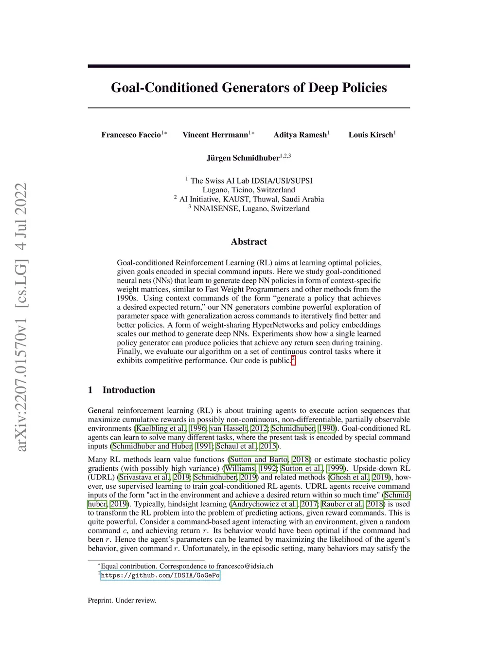 Goal-conditioned Reinforcement Learning (RL) aims at learning optimal policies, given goals encoded in special command inputs. Here we study goal-conditioned neural nets (NNs) that learn to generate deep NN policies in form of context-specific weight matrices, similar to Fast Weight Programmers and other methods from the 1990s. Using context commands of the form "generate a policy that achieves a desired expected return," our NN generators combine powerful exploration of parameter space with generalization across commands to iteratively find better and better policies. A form of weight-sharing HyperNetworks and policy embeddings scales our method to generate deep NNs. Experiments show how a single learned policy generator can produce policies that achieve any return seen during training. Finally, we evaluate our algorithm on a set of continuous control tasks where it exhibits competitive performance. Our code is public.