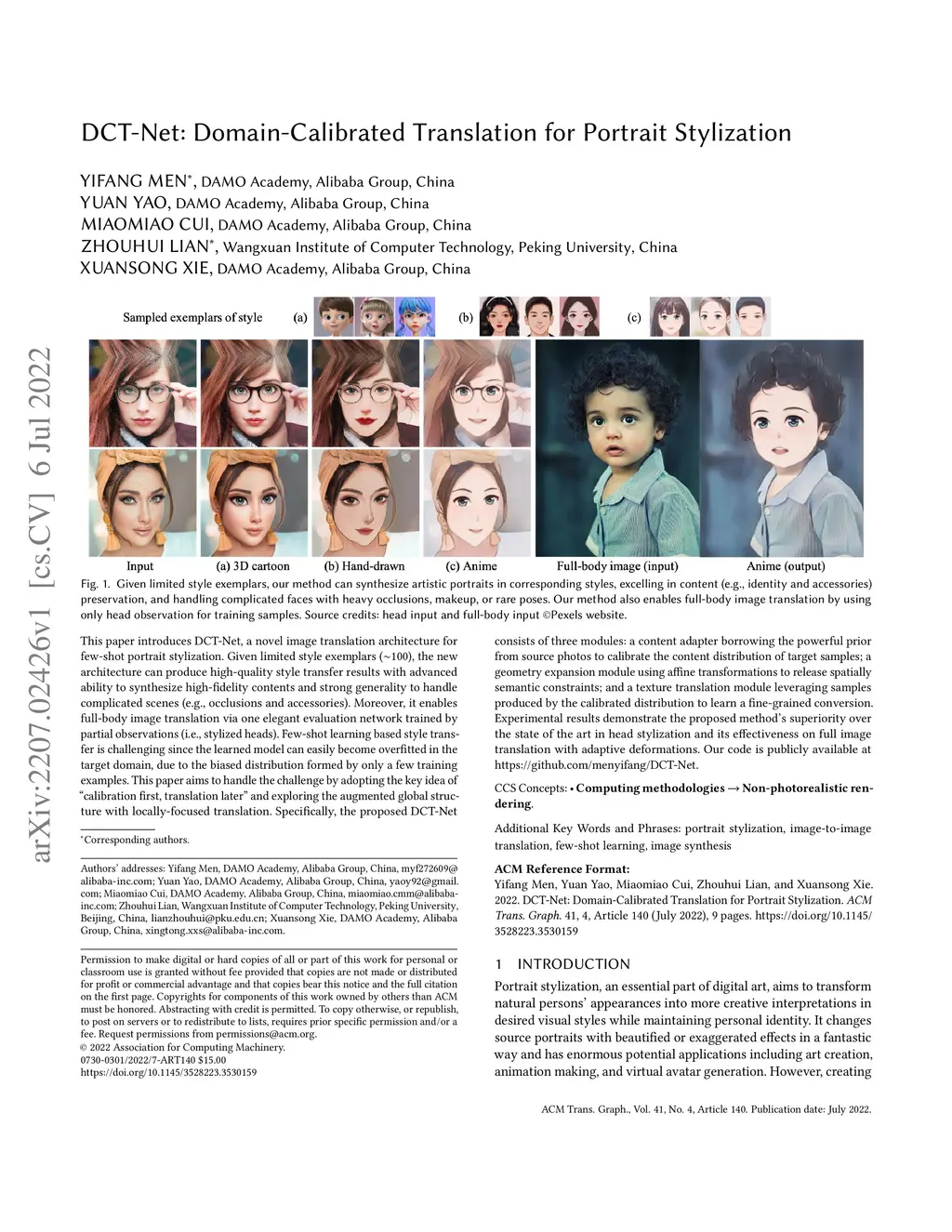 DCT-Net: Domain-Calibrated Translation for Portrait Stylization