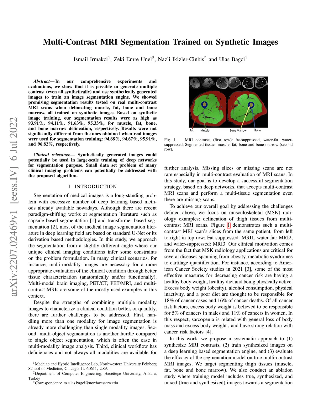In our comprehensive experiments and evaluations, we show that it is possible to generate multiple contrast (even all synthetically) and use synthetically generated images to train an image segmentation engine. We showed promising segmentation results tested on real multi-contrast MRI scans when delineating muscle, fat, bone and bone marrow, all trained on synthetic images. Based on synthetic image training, our segmentation results were as high as 93.91\%, 94.11\%, 91.63\%, 95.33\%, for muscle, fat, bone, and bone marrow delineation, respectively. Results were not significantly different from the ones obtained when real images were used for segmentation training: 94.68\%, 94.67\%, 95.91\%, and 96.82\%, respectively.