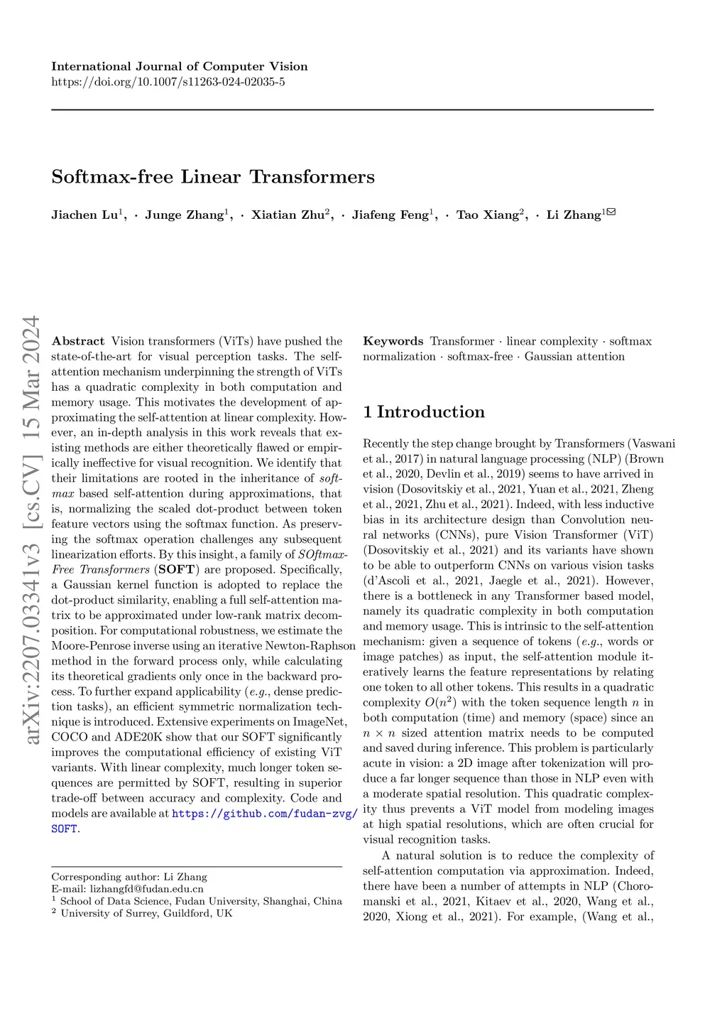 Vision transformers (ViTs) have pushed the state-of-the-art for visual perception tasks. The self-attention mechanism underpinning the strength of ViTs has a quadratic complexity in both computation and memory usage. This motivates the development of approximating the self-attention at linear complexity. However, an in-depth analysis in this work reveals that existing methods are either theoretically flawed or empirically ineffective for visual recognition. We identify that their limitations are rooted in the inheritance of softmax-based self-attention during approximations, that is, normalizing the scaled dot-product between token feature vectors using the softmax function. As preserving the softmax operation challenges any subsequent linearization efforts. By this insight, a family of Softmax-Free Transformers (SOFT) are proposed. Specifically, a Gaussian kernel function is adopted to replace the dot-product similarity, enabling a full self-attention matrix to be approximated under low-rank matrix decomposition. For computational robustness, we estimate the Moore-Penrose inverse using an iterative Newton-Raphson method in the forward process only, while calculating its theoretical gradients only once in the backward process. To further expand applicability (e.g., dense prediction tasks), an efficient symmetric normalization technique is introduced. Extensive experiments on ImageNet, COCO, and ADE20K show that our SOFT significantly improves the computational efficiency of existing ViT variants. With linear complexity, much longer token sequences are permitted by SOFT, resulting in superior trade-off between accuracy and complexity. Code and models are available at https://github.com/fudan-zvg/SOFT.