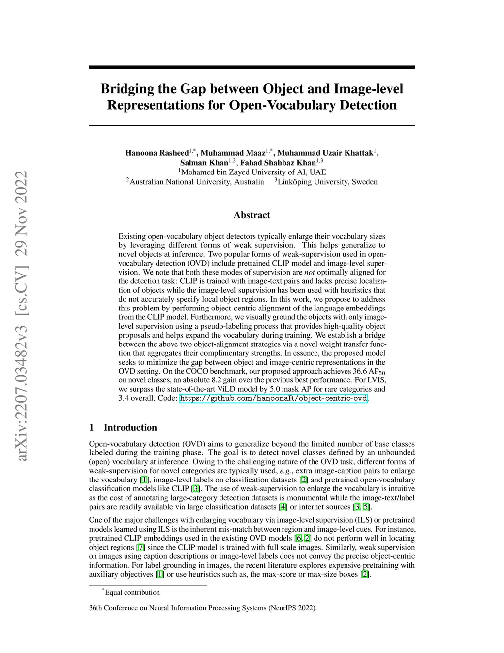 Existing open-vocabulary object detectors typically enlarge their vocabulary sizes by leveraging different forms of weak supervision. This helps generalize to novel objects at inference. Two popular forms of weak-supervision used in open-vocabulary detection (OVD) include pretrained CLIP model and image-level supervision. We note that both these modes of supervision are not optimally aligned for the detection task: CLIP is trained with image-text pairs and lacks precise localization of objects while the image-level supervision has been used with heuristics that do not accurately specify local object regions. In this work, we propose to address this problem by performing object-centric alignment of the language embeddings from the CLIP model. Furthermore, we visually ground the objects with only image-level supervision using a pseudo-labeling process that provides high-quality object proposals and helps expand the vocabulary during training. We establish a bridge between the above two object-alignment strategies via a novel weight transfer function that aggregates their complimentary strengths. In essence, the proposed model seeks to minimize the gap between object and image-centric representations in the OVD setting. On the COCO benchmark, our proposed approach achieves 36.6 AP50 on novel classes, an absolute 8.2 gain over the previous best performance. For LVIS, we surpass the state-of-the-art ViLD model by 5.0 mask AP for rare categories and 3.4 overall. Code: https://github.com/hanoonaR/object-centric-ovd.