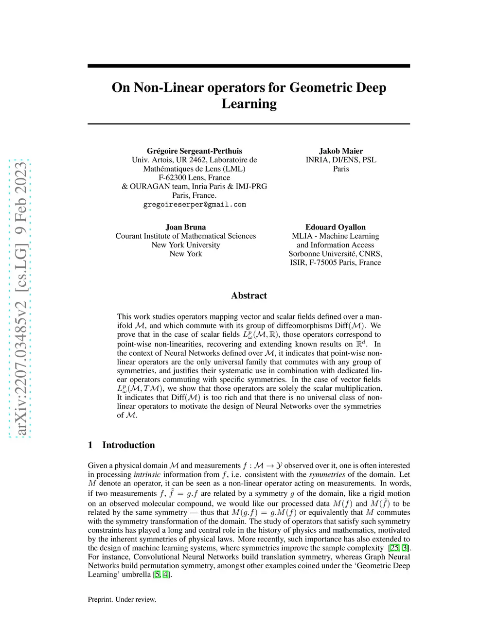 This work studies operators mapping vector and scalar fields defined over a manifold , and which commute with its group of diffeomorphisms . We prove that in the case of scalar fields , those operators correspond to point-wise non-linearities, recovering and extending known results on . In the context of Neural Networks defined over , it indicates that point-wise non-linear operators are the only universal family that commutes with any group of symmetries, and justifies their systematic use in combination with dedicated linear operators commuting with specific symmetries. In the case of vector fields , we show that those operators are solely the scalar multiplication. It indicates that is too rich and that there is no universal class of non-linear operators to motivate the design of Neural Networks over the symmetries of .