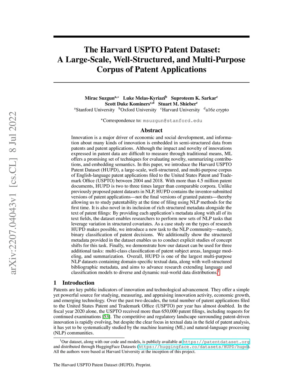 The Harvard USPTO Patent Dataset: A Large-Scale, Well-Structured, and