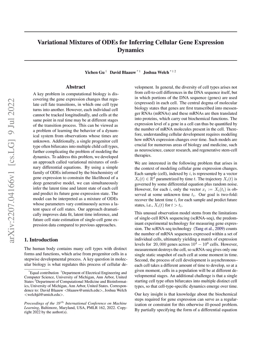 A key problem in computational biology is discovering the gene expression changes that regulate cell fate transitions, in which one cell type turns into another. However, each individual cell cannot be tracked longitudinally, and cells at the same point in real time may be at different stages of the transition process. This can be viewed as a problem of learning the behavior of a dynamical system from observations whose times are unknown. Additionally, a single progenitor cell type often bifurcates into multiple child cell types, further complicating the problem of modeling the dynamics. To address this problem, we developed an approach called variational mixtures of ordinary differential equations. By using a simple family of ODEs informed by the biochemistry of gene expression to constrain the likelihood of a deep generative model, we can simultaneously infer the latent time and latent state of each cell and predict its future gene expression state. The model can be interpreted as a mixture of ODEs whose parameters vary continuously across a latent space of cell states. Our approach dramatically improves data fit, latent time inference, and future cell state estimation of single-cell gene expression data compared to previous approaches.