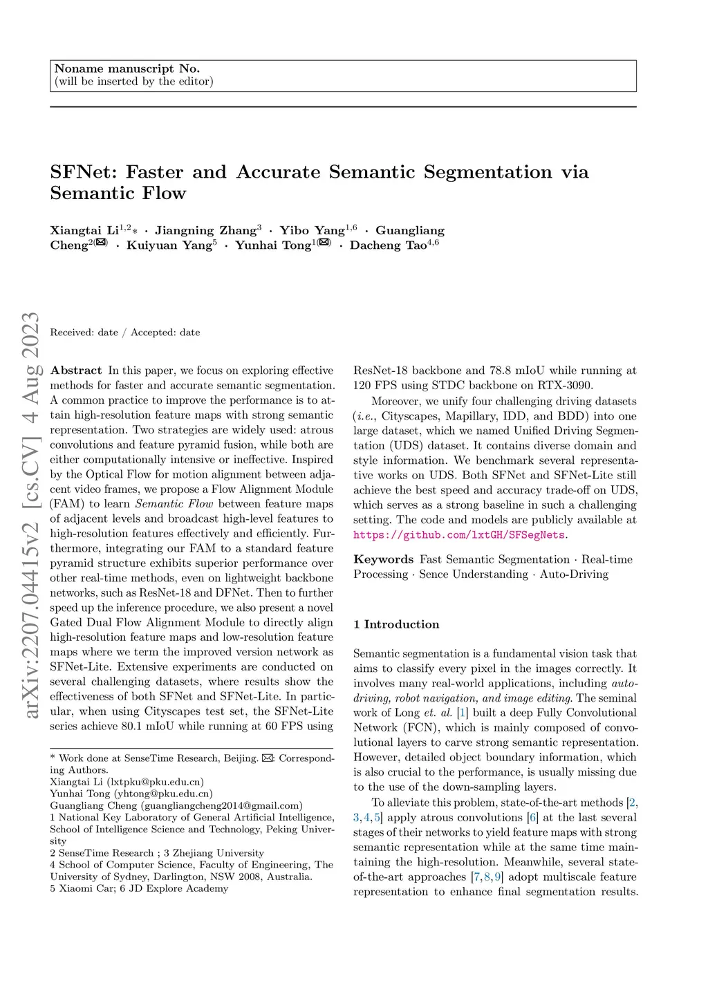 In this paper, we focus on exploring effective methods for faster and accurate semantic segmentation. A common practice to improve the performance is to attain high-resolution feature maps with strong semantic representation. Two strategies are widely used: atrous convolutions and feature pyramid fusion, while both are either computationally intensive or ineffective. Inspired by the Optical Flow for motion alignment between adjacent video frames, we propose a Flow Alignment Module (FAM) to learn \textit{Semantic Flow} between feature maps of adjacent levels and broadcast high-level features to high-resolution features effectively and efficiently. Furthermore, integrating our FAM to a standard feature pyramid structure exhibits superior performance over other real-time methods, even on lightweight backbone networks, such as ResNet-18 and DFNet. Then to further speed up the inference procedure, we also present a novel Gated Dual Flow Alignment Module to directly align high-resolution feature maps and low-resolution feature maps where we term the improved version network as SFNet-Lite. Extensive experiments are conducted on several challenging datasets, where results show the effectiveness of both SFNet and SFNet-Lite. In particular, when using Cityscapes test set, the SFNet-Lite series achieve 80.1 mIoU while running at 60 FPS using ResNet-18 backbone and 78.8 mIoU while running at 120 FPS using STDC backbone on RTX-3090. Moreover, we unify four challenging driving datasets into one large dataset, which we named Unified Driving Segmentation (UDS) dataset. It contains diverse domain and style information. We benchmark several representative works on UDS. Both SFNet and SFNet-Lite still achieve the best speed and accuracy trade-off on UDS, which serves as a strong baseline in such a challenging setting. The code and models are publicly available at https://github.com/lxtGH/SFSegNets.