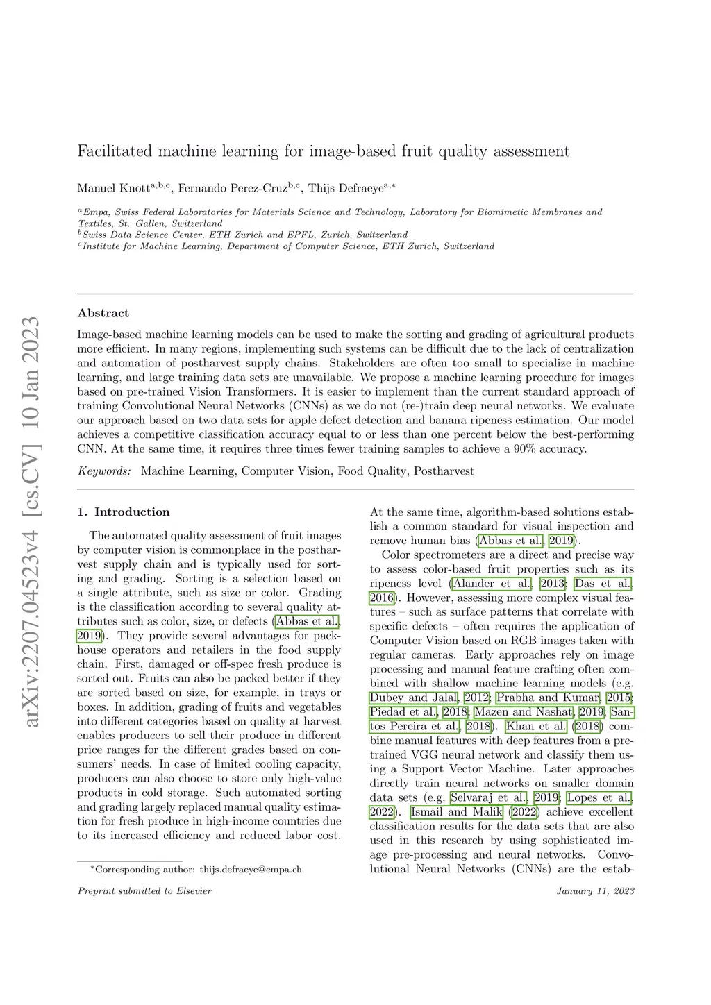 Image-based machine learning models can be used to make the sorting and grading of agricultural products more efficient. In many regions, implementing such systems can be difficult due to the lack of centralization and automation of postharvest supply chains. Stakeholders are often too small to specialize in machine learning, and large training data sets are unavailable. We propose a machine learning procedure for images based on pre-trained Vision Transformers. It is easier to implement than the current standard approach of training Convolutional Neural Networks (CNNs) as we do not (re-)train deep neural networks. We evaluate our approach based on two data sets for apple defect detection and banana ripeness estimation. Our model achieves a competitive classification accuracy equal to or less than one percent below the best-performing CNN. At the same time, it requires three times fewer training samples to achieve a 90% accuracy.