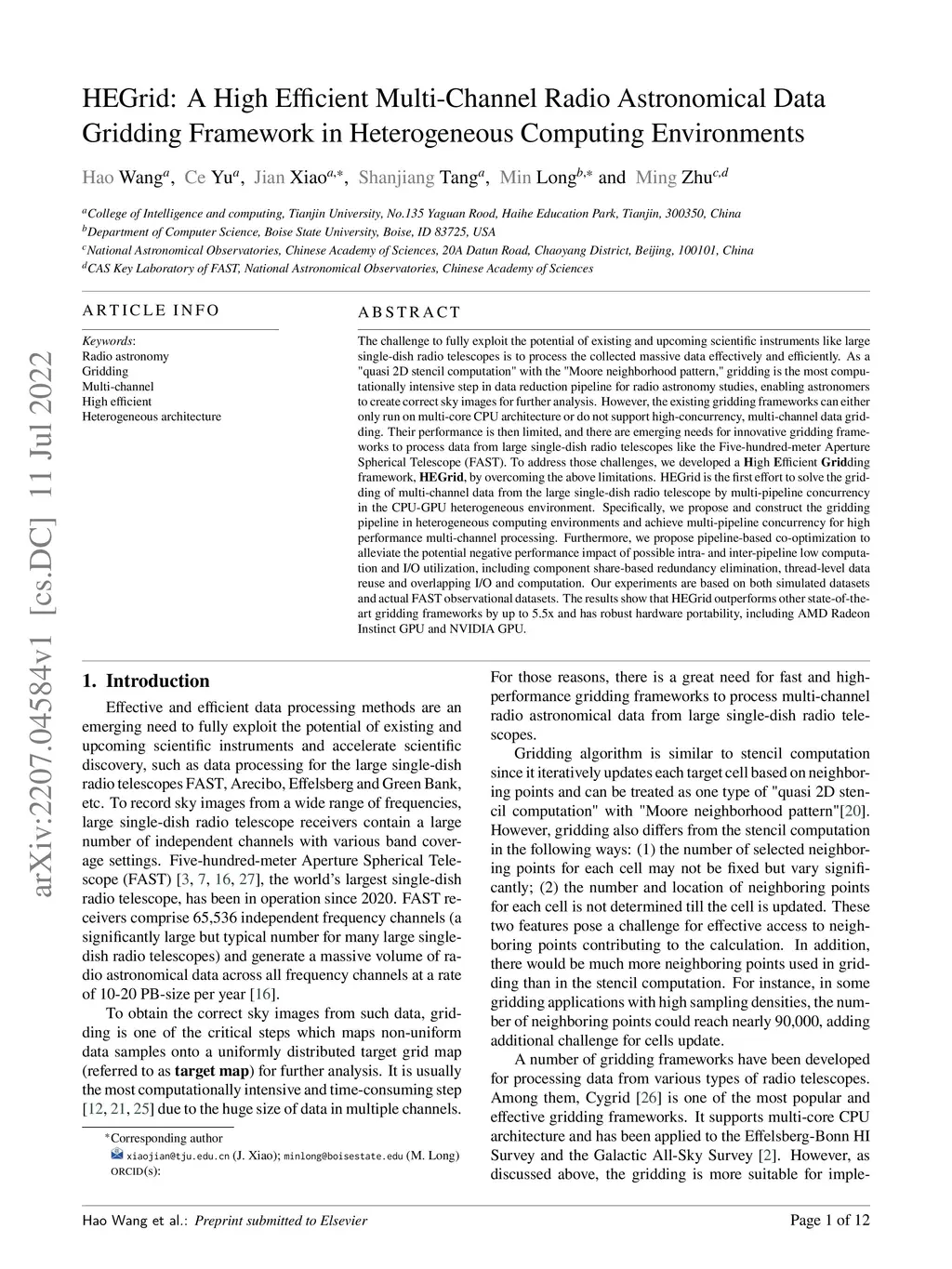 The challenge to fully exploit the potential of existing and upcoming scientific instruments like large single-dish radio telescopes is to process the collected massive data effectively and efficiently. As a "quasi 2D stencil computation" with the "Moore neighborhood pattern," gridding is the most computationally intensive step in data reduction pipeline for radio astronomy studies, enabling astronomers to create correct sky images for further analysis. However, the existing gridding frameworks can either only run on multi-core CPU architecture or do not support high-concurrency, multi-channel data gridding. Their performance is then limited, and there are emerging needs for innovative gridding frameworks to process data from large single-dish radio telescopes like the Five-hundred-meter Aperture Spherical Telescope (FAST). To address those challenges, we developed a High Efficient Gridding framework, HEGrid, by overcoming the above limitations. Specifically, we propose and construct the gridding pipeline in heterogeneous computing environments and achieve multi-pipeline concurrency for high performance multi-channel processing. Furthermore, we propose pipeline-based co-optimization to alleviate the potential negative performance impact of possible intra- and inter-pipeline low computation and I/O utilization, including component share-based redundancy elimination, thread-level data reuse and overlapping I/O and computation. Our experiments are based on both simulated datasets and actual FAST observational datasets. The results show that HEGrid outperforms other state-of-the-art gridding frameworks by up to 5.5x and has robust hardware portability, including AMD Radeon Instinct GPU and NVIDIA GPU.