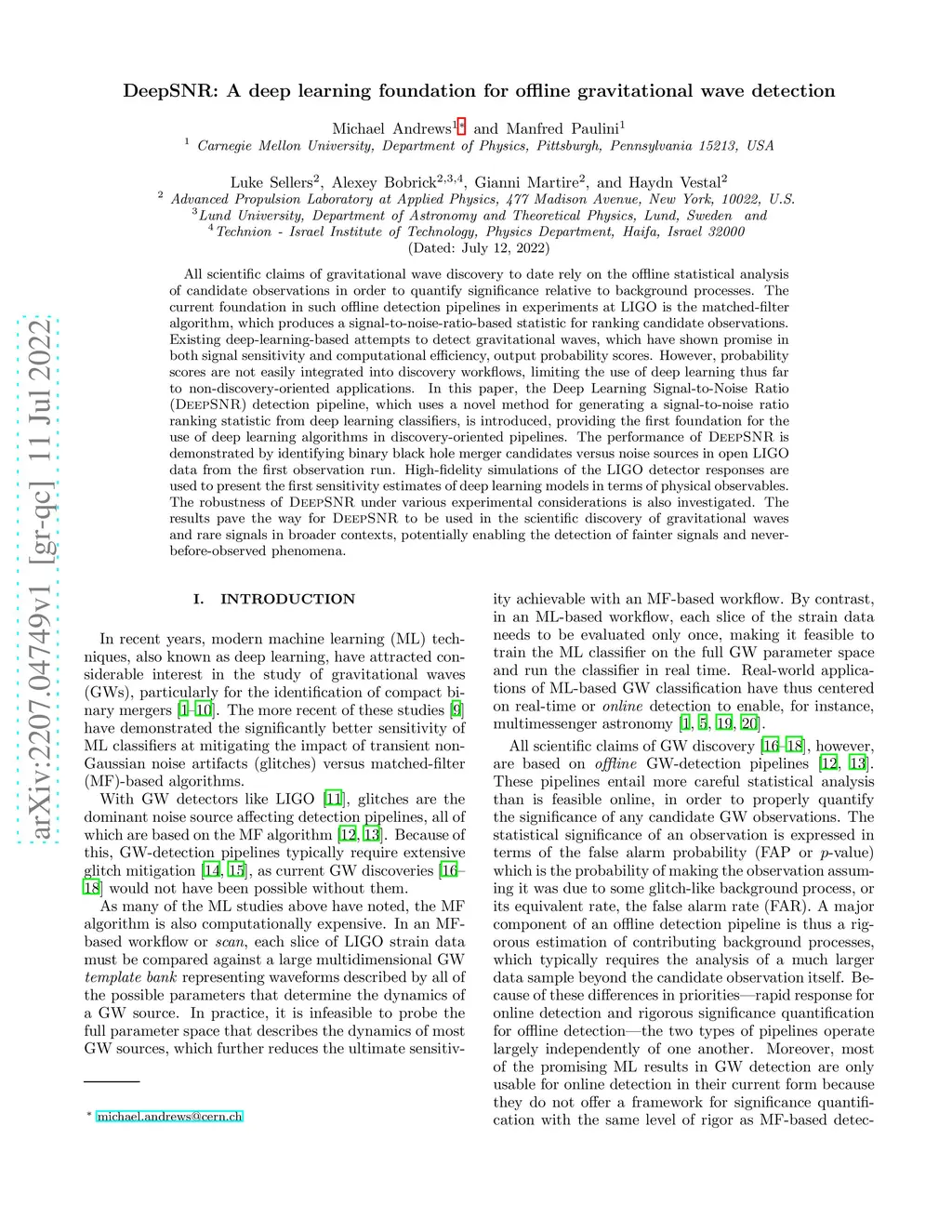 All scientific claims of gravitational wave discovery to date rely on the offline statistical analysis of candidate observations in order to quantify significance relative to background processes. The current foundation in such offline detection pipelines in experiments at LIGO is the matched-filter algorithm, which produces a signal-to-noise-ratio-based statistic for ranking candidate observations. Existing deep-learning-based attempts to detect gravitational waves, which have shown promise in both signal sensitivity and computational efficiency, output probability scores. However, probability scores are not easily integrated into discovery workflows, limiting the use of deep learning thus far to non-discovery-oriented applications. In this paper, the Deep Learning Signal-to-Noise Ratio (DeepSNR) detection pipeline, which uses a novel method for generating a signal-to-noise ratio ranking statistic from deep learning classifiers, is introduced, providing the first foundation for the use of deep learning algorithms in discovery-oriented pipelines. The performance of DeepSNR is demonstrated by identifying binary black hole merger candidates versus noise sources in open LIGO data from the first observation run. High-fidelity simulations of the LIGO detector responses are used to present the first sensitivity estimates of deep learning models in terms of physical observables. The robustness of DeepSNR under various experimental considerations is also investigated. The results pave the way for DeepSNR to be used in the scientific discovery of gravitational waves and rare signals in broader contexts, potentially enabling the detection of fainter signals and never-before-observed phenomena.
