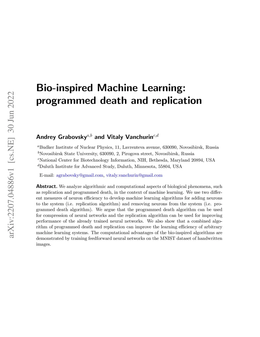 We analyze algorithmic and computational aspects of biological phenomena, such as replication and programmed death, in the context of machine learning. We use two different measures of neuron efficiency to develop machine learning algorithms for adding neurons to the system (i.e. replication algorithm) and removing neurons from the system (i.e. programmed death algorithm). We argue that the programmed death algorithm can be used for compression of neural networks and the replication algorithm can be used for improving performance of the already trained neural networks. We also show that a combined algorithm of programmed death and replication can improve the learning efficiency of arbitrary machine learning systems. The computational advantages of the bio-inspired algorithms are demonstrated by training feedforward neural networks on the MNIST dataset of handwritten images.