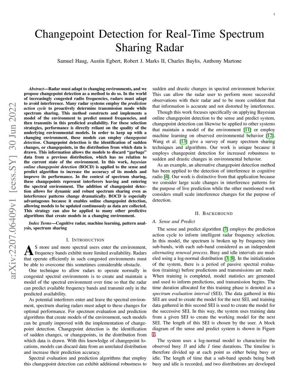 Radar must adapt to changing environments, and we propose changepoint detection as a method to do so. In the world of increasingly congested radio frequencies, radars must adapt to avoid interference. Many radar systems employ the prediction action cycle to proactively determine transmission mode while spectrum sharing. This method constructs and implements a model of the environment to predict unused frequencies, and then transmits in this predicted availability. For these selection strategies, performance is directly reliant on the quality of the underlying environmental models. In order to keep up with a changing environment, these models can employ changepoint detection. Changepoint detection is the identification of sudden changes, or changepoints, in the distribution from which data is drawn. This information allows the models to discard "garbage" data from a previous distribution, which has no relation to the current state of the environment. In this work, bayesian online changepoint detection (BOCD) is applied to the sense and predict algorithm to increase the accuracy of its models and improve its performance. In the context of spectrum sharing, these changepoints represent interferers leaving and entering the spectral environment. The addition of changepoint detection allows for dynamic and robust spectrum sharing even as interference patterns change dramatically. BOCD is especially advantageous because it enables online changepoint detection, allowing models to be updated continuously as data are collected. This strategy can also be applied to many other predictive algorithms that create models in a changing environment.