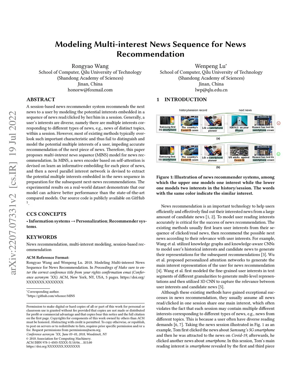 A session-based news recommender system recommends the next news to a user by modeling the potential interests embedded in a sequence of news read/clicked by her/him in a session. Generally, a user's interests are diverse, namely there are multiple interests corresponding to different types of news, e.g., news of distinct topics, within a session. %Modeling such multiple interests is critical for precise news recommendation. However, most of existing methods typically overlook such important characteristic and thus fail to distinguish and model the potential multiple interests of a user, impeding accurate recommendation of the next piece of news. Therefore, this paper proposes multi-interest news sequence (MINS) model for news recommendation. In MINS, a news encoder based on self-attention is devised on learn an informative embedding for each piece of news, and then a novel parallel interest network is devised to extract the potential multiple interests embedded in the news sequence in preparation for the subsequent next-news recommendations. The experimental results on a real-world dataset demonstrate that our model can achieve better performance than the state-of-the-art compared models.