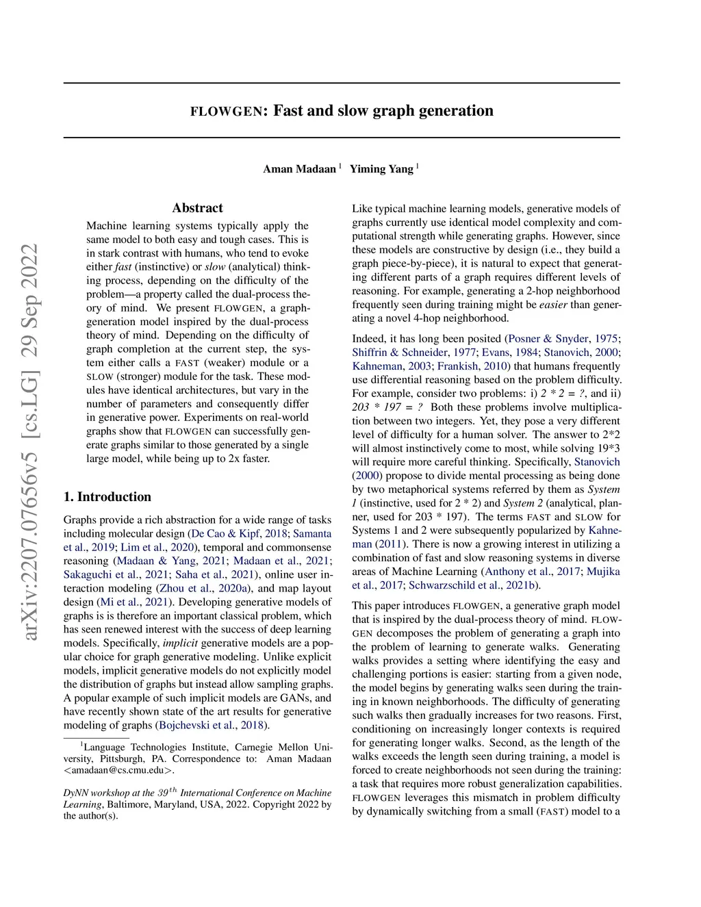 Machine learning systems typically apply the same model to both easy and tough cases. This is in stark contrast with humans, who tend to evoke either fast (instinctive) or slow (analytical) thinking depending on the problem difficulty, a property called the dual-process theory of mind. We present FLOWGEN, a graph-generation model inspired by the dual-process theory of mind that generates large graphs incrementally. Depending on the difficulty of completing the graph at the current step, graph generation is routed to either a fast (weaker) or a slow (stronger) model. These modules have identical architectures, but vary in the number of parameters and consequently differ in generative power. Experiments on real-world graphs show that ours can successfully generate graphs similar to those generated by a single large model, while being up to 2x faster.