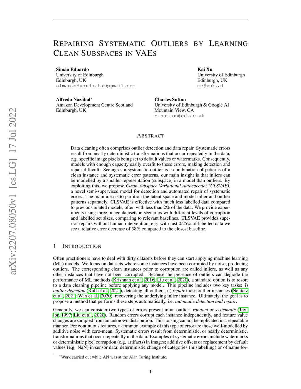 Data cleaning often comprises outlier detection and data repair. Systematic errors result from nearly deterministic transformations that occur repeatedly in the data, e.g. specific image pixels being set to default values or watermarks. Consequently, models with enough capacity easily overfit to these errors, making detection and repair difficult. Seeing as a systematic outlier is a combination of patterns of a clean instance and systematic error patterns, our main insight is that inliers can be modelled by a smaller representation (subspace) in a model than outliers. By exploiting this, we propose Clean Subspace Variational Autoencoder (CLSVAE), a novel semi-supervised model for detection and automated repair of systematic errors. The main idea is to partition the latent space and model inlier and outlier patterns separately. CLSVAE is effective with much less labelled data compared to previous related models, often with less than 2% of the data. We provide experiments using three image datasets in scenarios with different levels of corruption and labelled set sizes, comparing to relevant baselines. CLSVAE provides superior repairs without human intervention, e.g. with just 0.25% of labelled data we see a relative error decrease of 58% compared to the closest baseline.