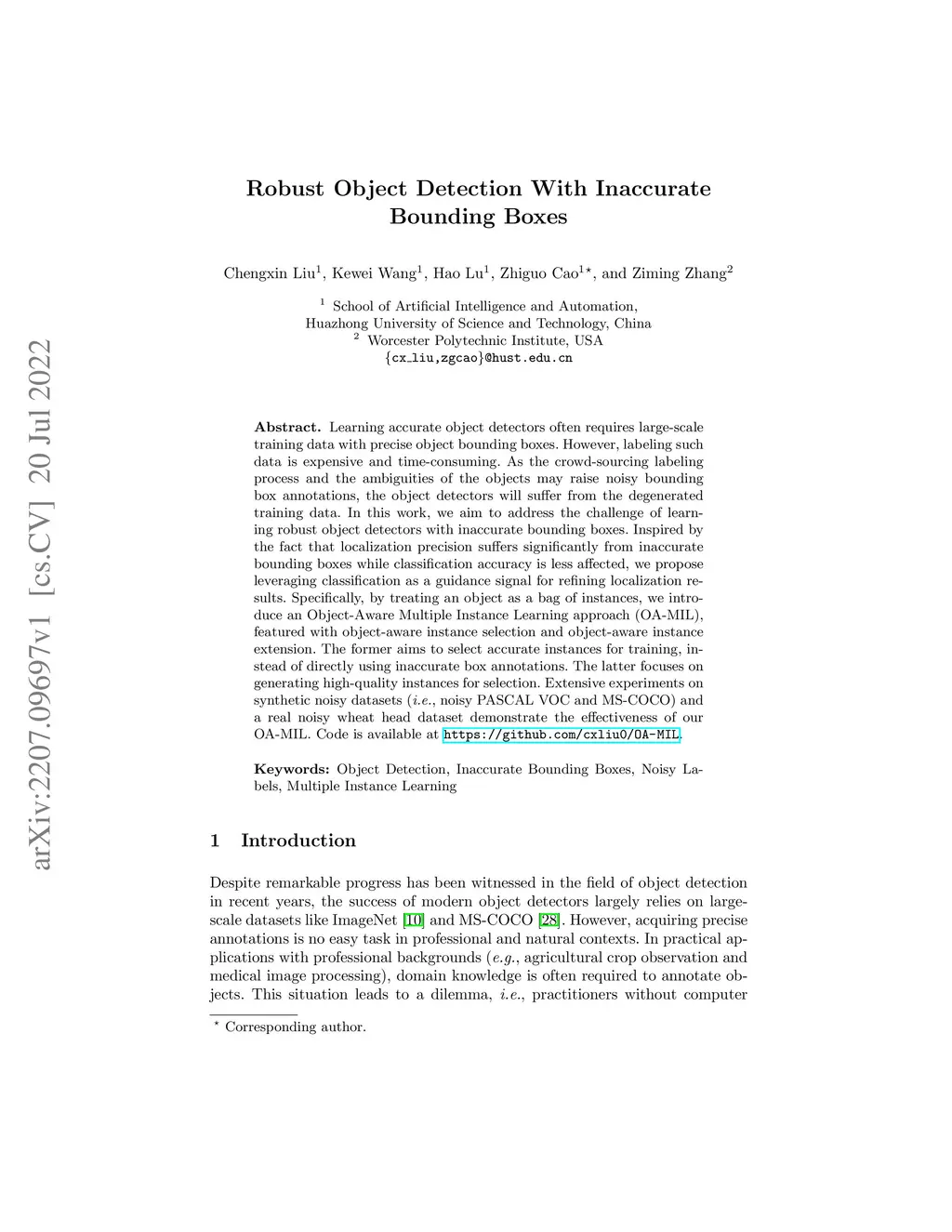 Learning accurate object detectors often requires large-scale training data with precise object bounding boxes. However, labeling such data is expensive and time-consuming. As the crowd-sourcing labeling process and the ambiguities of the objects may raise noisy bounding box annotations, the object detectors will suffer from the degenerated training data. In this work, we aim to address the challenge of learning robust object detectors with inaccurate bounding boxes. Inspired by the fact that localization precision suffers significantly from inaccurate bounding boxes while classification accuracy is less affected, we propose leveraging classification as a guidance signal for refining localization results. Specifically, by treating an object as a bag of instances, we introduce an Object-Aware Multiple Instance Learning approach (OA-MIL), featured with object-aware instance selection and object-aware instance extension. The former aims to select accurate instances for training, instead of directly using inaccurate box annotations. The latter focuses on generating high-quality instances for selection. Extensive experiments on synthetic noisy datasets (i.e., noisy PASCAL VOC and MS-COCO) and a real noisy wheat head dataset demonstrate the effectiveness of our OA-MIL. Code is available at https://github.com/cxliu0/OA-MIL.