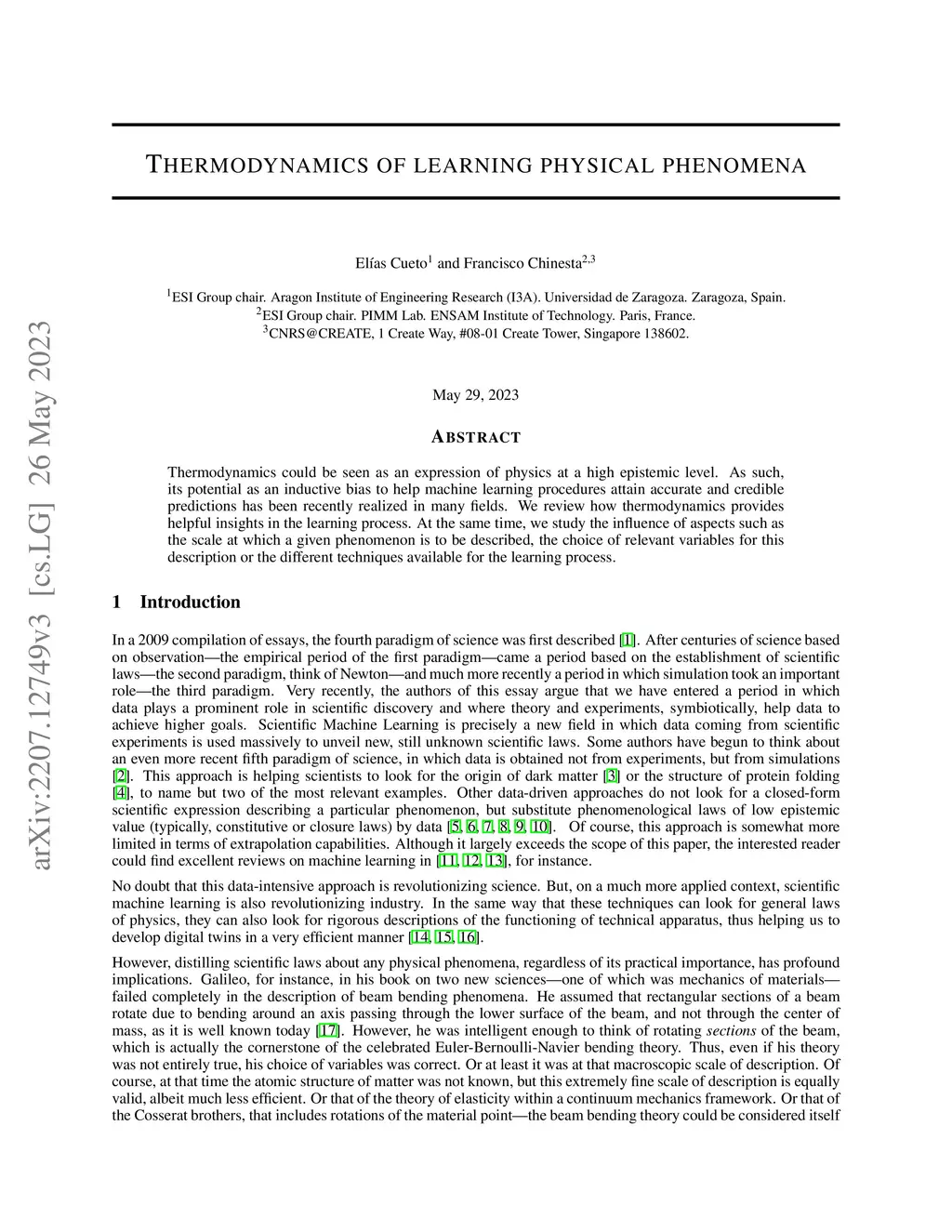 Thermodynamics could be seen as an expression of physics at a high epistemic level. As such, its potential as an inductive bias to help machine learning procedures attain accurate and credible predictions has been recently realized in many fields. We review how thermodynamics provides helpful insights in the learning process. At the same time, we study the influence of aspects such as the scale at which a given phenomenon is to be described, the choice of relevant variables for this description or the different techniques available for the learning process.
