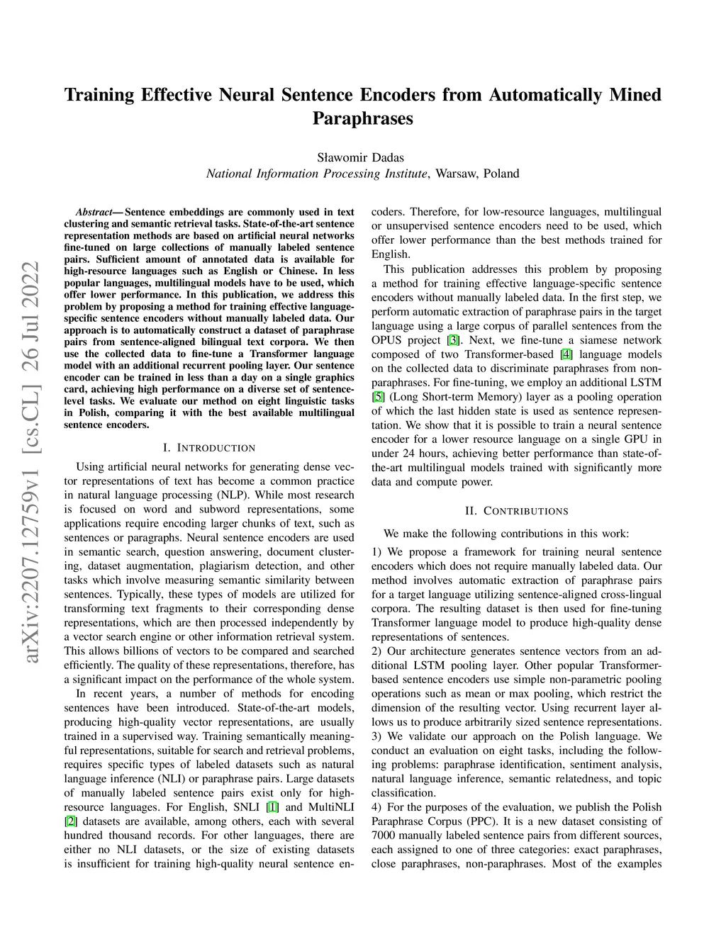 Sentence embeddings are commonly used in text clustering and semantic retrieval tasks. State-of-the-art sentence representation methods are based on artificial neural networks fine-tuned on large collections of manually labeled sentence pairs. Sufficient amount of annotated data is available for high-resource languages such as English or Chinese. In less popular languages, multilingual models have to be used, which offer lower performance. In this publication, we address this problem by proposing a method for training effective language-specific sentence encoders without manually labeled data. Our approach is to automatically construct a dataset of paraphrase pairs from sentence-aligned bilingual text corpora. We then use the collected data to fine-tune a Transformer language model with an additional recurrent pooling layer. Our sentence encoder can be trained in less than a day on a single graphics card, achieving high performance on a diverse set of sentence-level tasks. We evaluate our method on eight linguistic tasks in Polish, comparing it with the best available multilingual sentence encoders.