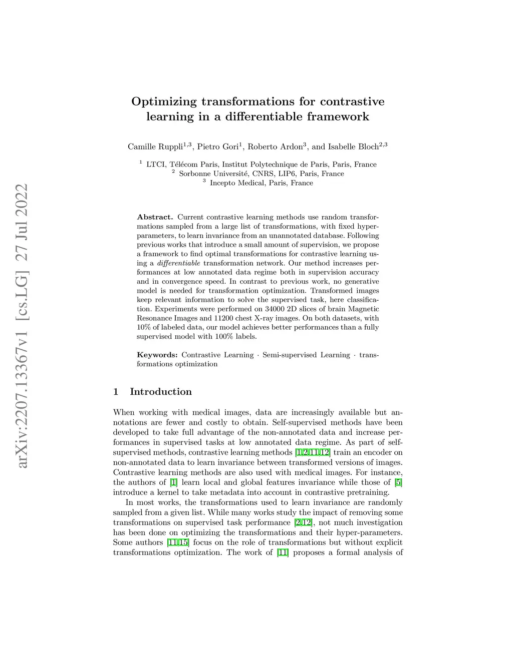 Current contrastive learning methods use random transformations sampled from a large list of transformations, with fixed hyperparameters, to learn invariance from an unannotated database. Following previous works that introduce a small amount of supervision, we propose a framework to find optimal transformations for contrastive learning using a differentiable transformation network. Our method increases performances at low annotated data regime both in supervision accuracy and in convergence speed. In contrast to previous work, no generative model is needed for transformation optimization. Transformed images keep relevant information to solve the supervised task, here classification. Experiments were performed on 34000 2D slices of brain Magnetic Resonance Images and 11200 chest X-ray images. On both datasets, with 10% of labeled data, our model achieves better performances than a fully supervised model with 100% labels.