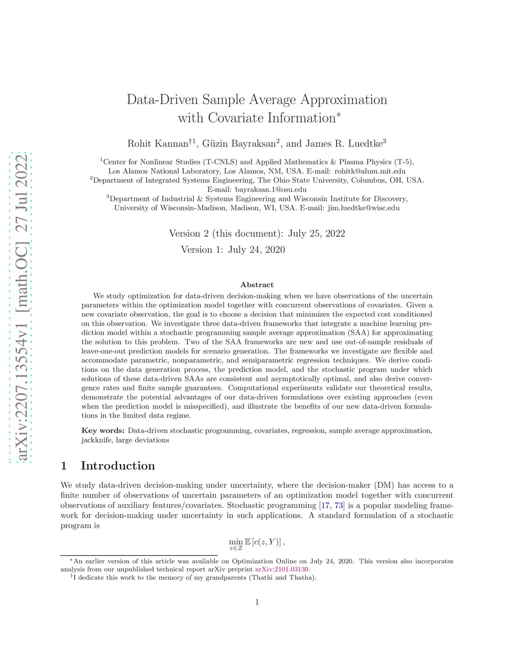 We study optimization for data-driven decision-making when we have observations of the uncertain parameters within the optimization model together with concurrent observations of covariates. Given a new covariate observation, the goal is to choose a decision that minimizes the expected cost conditioned on this observation. We investigate three data-driven frameworks that integrate a machine learning prediction model within a stochastic programming sample average approximation (SAA) for approximating the solution to this problem. Two of the SAA frameworks are new and use out-of-sample residuals of leave-one-out prediction models for scenario generation. The frameworks we investigate are flexible and accommodate parametric, nonparametric, and semiparametric regression techniques. We derive conditions on the data generation process, the prediction model, and the stochastic program under which solutions of these data-driven SAAs are consistent and asymptotically optimal, and also derive convergence rates and finite sample guarantees. Computational experiments validate our theoretical results, demonstrate the potential advantages of our data-driven formulations over existing approaches (even when the prediction model is misspecified), and illustrate the benefits of our new data-driven formulations in the limited data regime.