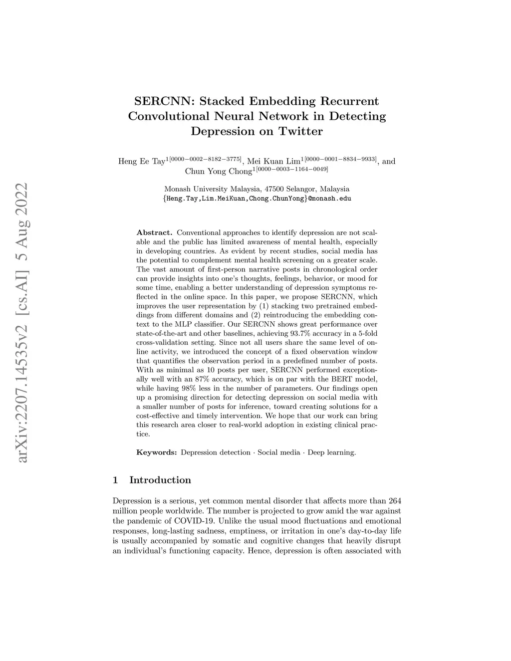 Conventional approaches to identify depression are not scalable, and the public has limited awareness of mental health, especially in developing countries. As evident by recent studies, social media has the potential to complement mental health screening on a greater scale. The vast amount of first-person narrative posts in chronological order can provide insights into one's thoughts, feelings, behavior, or mood for some time, enabling a better understanding of depression symptoms reflected in the online space. In this paper, we propose SERCNN, which improves the user representation by (1) stacking two pretrained embeddings from different domains and (2) reintroducing the embedding context to the MLP classifier. Our SERCNN shows great performance over state-of-the-art and other baselines, achieving 93.7% accuracy in a 5-fold cross-validation setting. Since not all users share the same level of online activity, we introduced the concept of a fixed observation window that quantifies the observation period in a predefined number of posts. With as minimal as 10 posts per user, SERCNN performed exceptionally well with an 87% accuracy, which is on par with the BERT model, while having 98% less in the number of parameters. Our findings open up a promising direction for detecting depression on social media with a smaller number of posts for inference, towards creating solutions for a cost-effective and timely intervention. We hope that our work can bring this research area closer to real-world adoption in existing clinical practice.