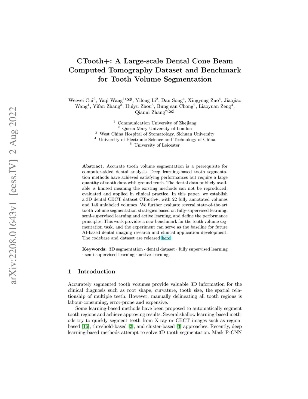 Accurate tooth volume segmentation is a prerequisite for computer-aided dental analysis. Deep learning-based tooth segmentation methods have achieved satisfying performances but require a large quantity of tooth data with ground truth. The dental data publicly available is limited meaning the existing methods can not be reproduced, evaluated and applied in clinical practice. In this paper, we establish a 3D dental CBCT dataset CTooth+, with 22 fully annotated volumes and 146 unlabeled volumes. We further evaluate several state-of-the-art tooth volume segmentation strategies based on fully-supervised learning, semi-supervised learning and active learning, and define the performance principles. This work provides a new benchmark for the tooth volume segmentation task, and the experiment can serve as the baseline for future AI-based dental imaging research and clinical application development.