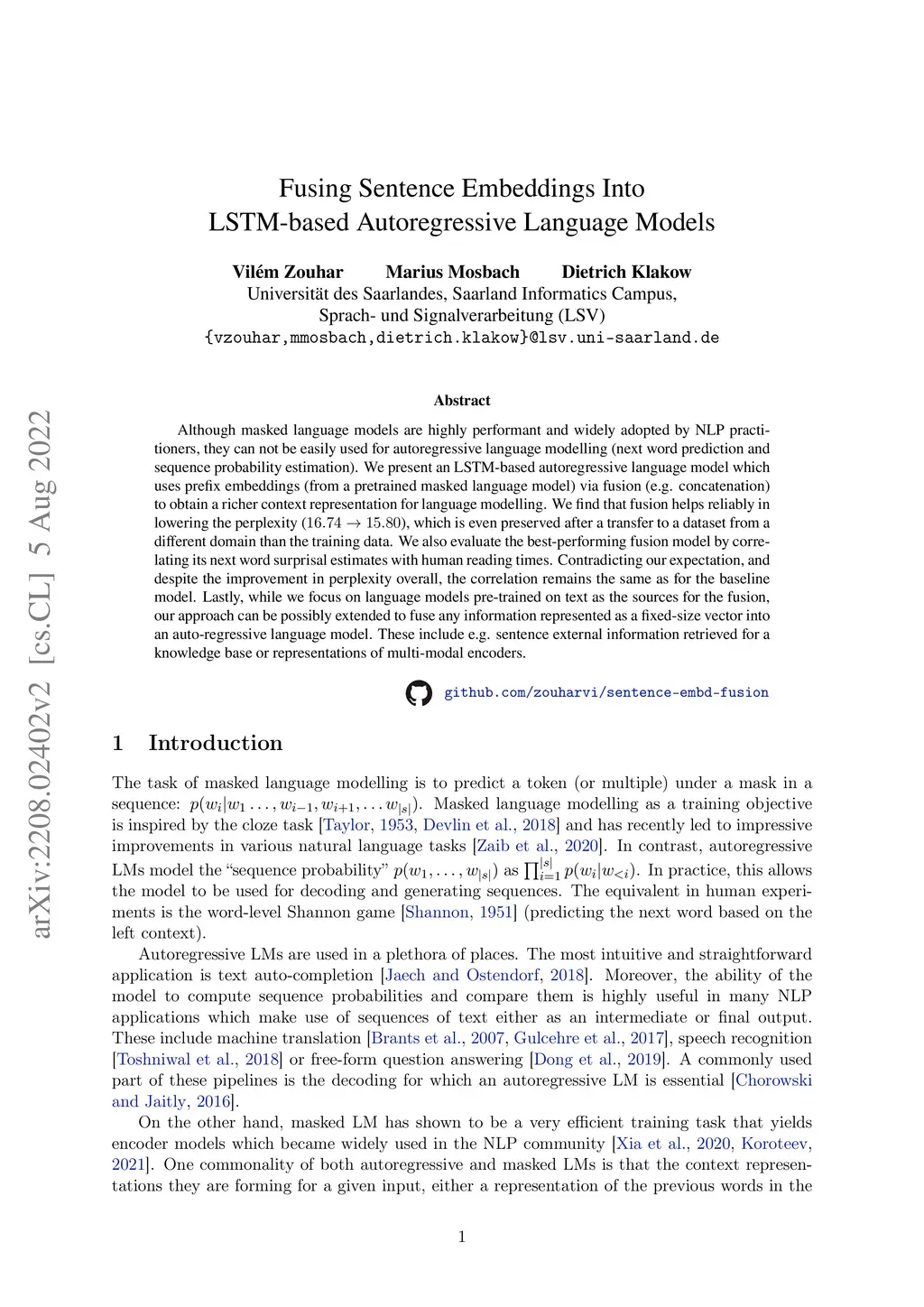 Fusing Sentence Embeddings Into LSTM-based Autoregressive Language