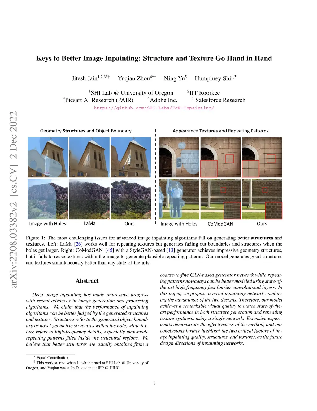 Deep image inpainting has made impressive progress with recent advances in image generation and processing algorithms. We claim that the performance of inpainting algorithms can be better judged by the generated structures and textures. Structures refer to the generated object boundary or novel geometric structures within the hole, while texture refers to high-frequency details, especially man-made repeating patterns filled inside the structural regions. We believe that better structures are usually obtained from a coarse-to-fine GAN-based generator network while repeating patterns nowadays can be better modeled using state-of-the-art high-frequency fast fourier convolutional layers. In this paper, we propose a novel inpainting network combining the advantages of the two designs. Therefore, our model achieves a remarkable visual quality to match state-of-the-art performance in both structure generation and repeating texture synthesis using a single network. Extensive experiments demonstrate the effectiveness of the method, and our conclusions further highlight the two critical factors of image inpainting quality, structures, and textures, as the future design directions of inpainting networks.