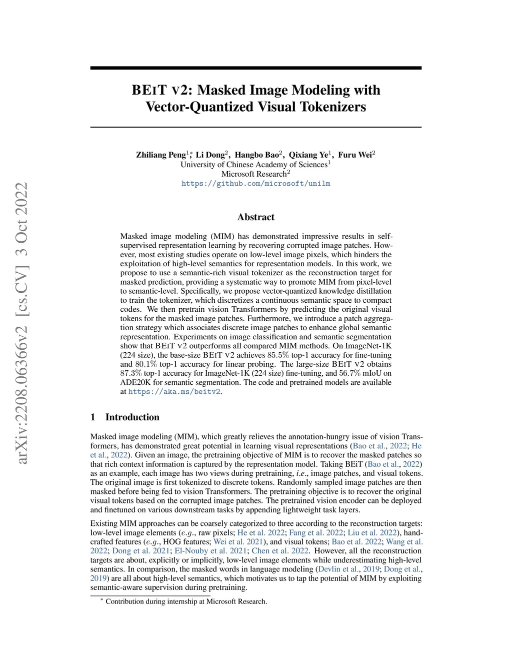 BEiT v2: Masked Image Modeling with Vector-Quantized Visual Tokenizers