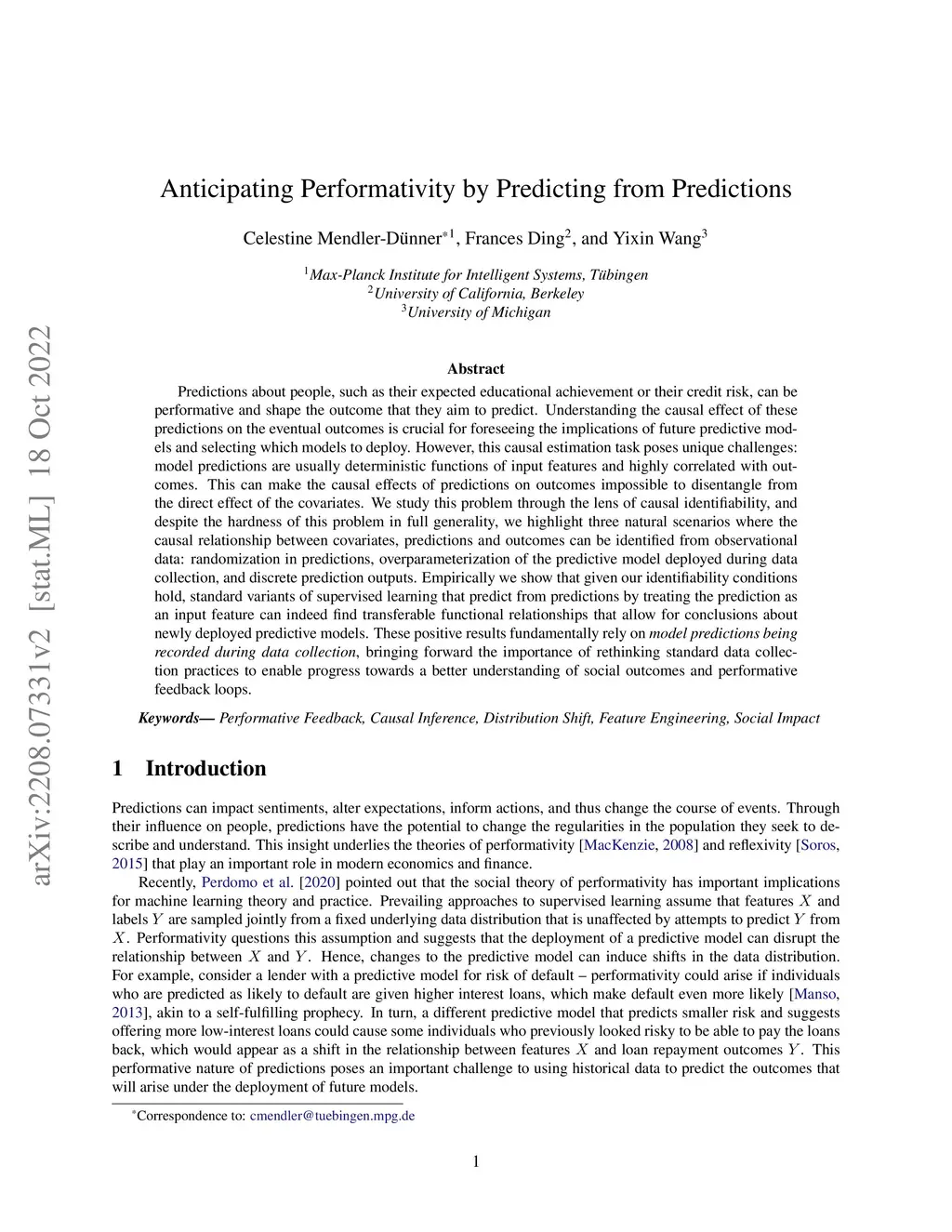 Predictions about people, such as their expected educational achievement or their credit risk, can be performative and shape the outcome that they aim to predict. Understanding the causal effect of these predictions on the eventual outcomes is crucial for foreseeing the implications of future predictive models and selecting which models to deploy. However, this causal estimation task poses unique challenges: model predictions are usually deterministic functions of input features and highly correlated with outcomes. This can make the causal effects of predictions on outcomes impossible to disentangle from the direct effect of the covariates. We study this problem through the lens of causal identifiability, and despite the hardness of this problem in full generality, we highlight three natural scenarios where the causal relationship between covariates, predictions and outcomes can be identified from observational data: randomization in predictions, overparameterization of the predictive model deployed during data collection, and discrete prediction outputs. Empirically we show that given our identifiability conditions hold, standard variants of supervised learning that predict from predictions by treating the prediction as an input feature can indeed find transferable functional relationships that allow for conclusions about newly deployed predictive models. These positive results fundamentally rely on model predictions being recorded during data collection, bringing forward the importance of rethinking standard data collection practices to enable progress towards a better understanding of social outcomes and performative feedback loops.