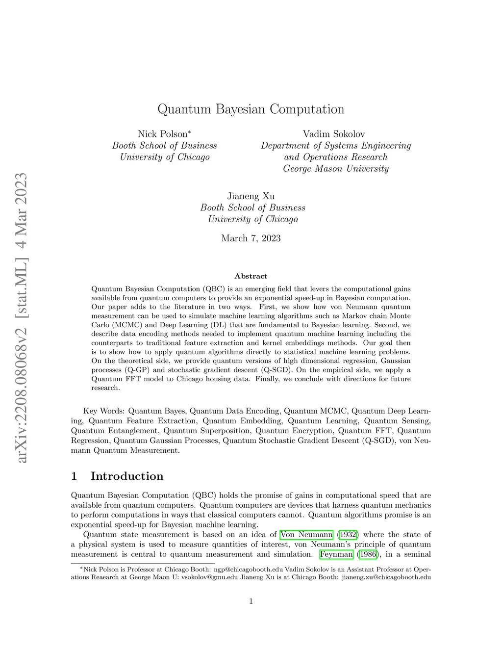 Quantum Bayesian Computation (QBC) is an emerging field that levers the computational gains available from quantum computers to provide an exponential speed-up in Bayesian computation. Our paper adds to the literature in two ways. First, we show how von Neumann quantum measurement can be used to simulate machine learning algorithms such as Markov chain Monte Carlo (MCMC) and Deep Learning (DL) that are fundamental to Bayesian learning. Second, we describe data encoding methods needed to implement quantum machine learning including the counterparts to traditional feature extraction and kernel embeddings methods. Our goal then is to show how to apply quantum algorithms directly to statistical machine learning problems. On the theoretical side, we provide quantum versions of high dimensional regression, Gaussian processes (Q-GP) and stochastic gradient descent (Q-SGD). On the empirical side, we apply a Quantum FFT model to Chicago housing data. Finally, we conclude with directions for future research.