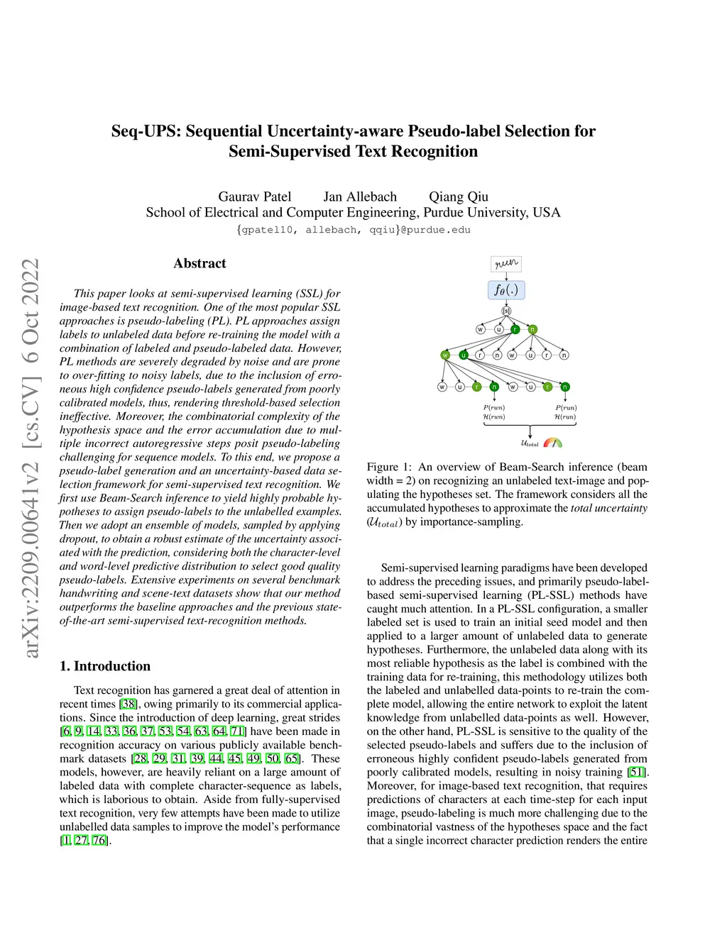 This paper looks at semi-supervised learning (SSL) for image-based text recognition. One of the most popular SSL approaches is pseudo-labeling (PL). PL approaches assign labels to unlabeled data before re-training the model with a combination of labeled and pseudo-labeled data. However, PL methods are severely degraded by noise and are prone to over-fitting to noisy labels, due to the inclusion of erroneous high confidence pseudo-labels generated from poorly calibrated models, thus, rendering threshold-based selection ineffective. Moreover, the combinatorial complexity of the hypothesis space and the error accumulation due to multiple incorrect autoregressive steps posit pseudo-labeling challenging for sequence models. To this end, we propose a pseudo-label generation and an uncertainty-based data selection framework for semi-supervised text recognition. We first use Beam-Search inference to yield highly probable hypotheses to assign pseudo-labels to the unlabelled examples. Then we adopt an ensemble of models, sampled by applying dropout, to obtain a robust estimate of the uncertainty associated with the prediction, considering both the character-level and word-level predictive distribution to select good quality pseudo-labels. Extensive experiments on several benchmark handwriting and scene-text datasets show that our method outperforms the baseline approaches and the previous state-of-the-art semi-supervised text-recognition methods.