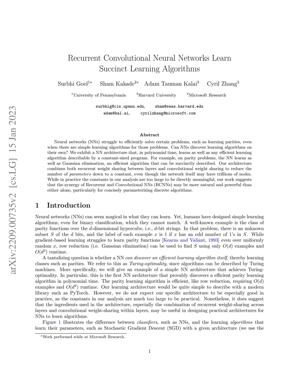 Neural networks (NNs) struggle to efficiently solve certain problems, such as learning parities, even when there are simple learning algorithms for those problems. Can NNs discover learning algorithms on their own? We exhibit a NN architecture that, in polynomial time, learns as well as any efficient learning algorithm describable by a constant-sized program. For example, on parity problems, the NN learns as well as Gaussian elimination, an efficient algorithm that can be succinctly described. Our architecture combines both recurrent weight sharing between layers and convolutional weight sharing to reduce the number of parameters down to a constant, even though the network itself may have trillions of nodes. While in practice the constants in our analysis are too large to be directly meaningful, our work suggests that the synergy of Recurrent and Convolutional NNs (RCNNs) may be more natural and powerful than either alone, particularly for concisely parameterizing discrete algorithms.