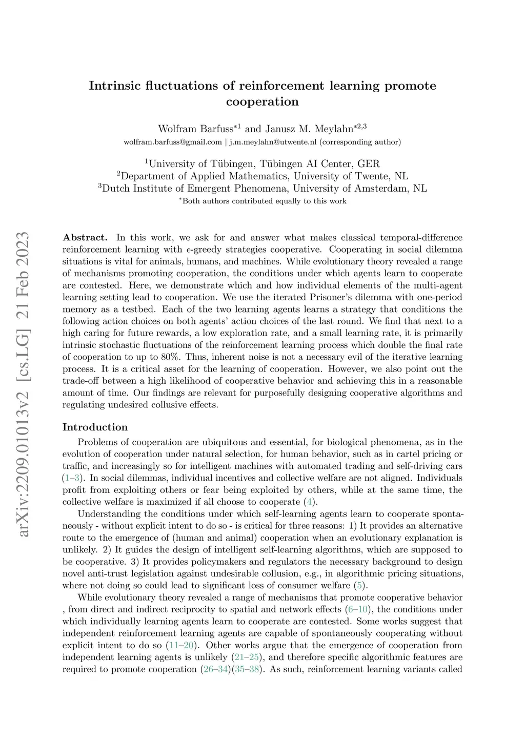In this work, we ask for and answer what makes classical temporal-difference reinforcement learning with epsilon-greedy strategies cooperative. Cooperating in social dilemma situations is vital for animals, humans, and machines. While evolutionary theory revealed a range of mechanisms promoting cooperation, the conditions under which agents learn to cooperate are contested. Here, we demonstrate which and how individual elements of the multi-agent learning setting lead to cooperation. We use the iterated Prisoner's dilemma with one-period memory as a testbed. Each of the two learning agents learns a strategy that conditions the following action choices on both agents' action choices of the last round. We find that next to a high caring for future rewards, a low exploration rate, and a small learning rate, it is primarily intrinsic stochastic fluctuations of the reinforcement learning process which double the final rate of cooperation to up to 80%. Thus, inherent noise is not a necessary evil of the iterative learning process. It is a critical asset for the learning of cooperation. However, we also point out the trade-off between a high likelihood of cooperative behavior and achieving this in a reasonable amount of time. Our findings are relevant for purposefully designing cooperative algorithms and regulating undesired collusive effects.